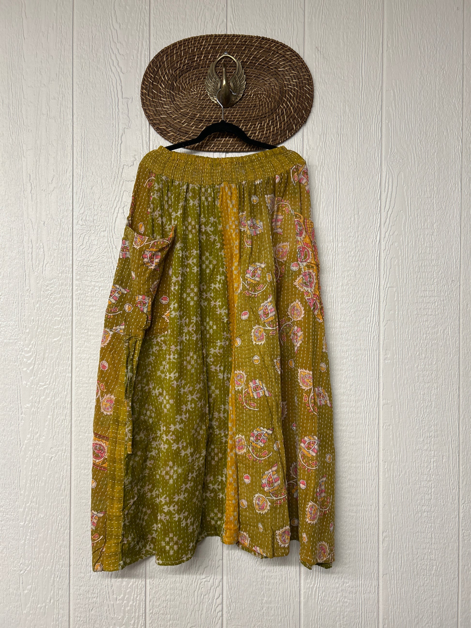 Crafted from kantha stitched vintage cotton sari this absolute dream features slouchy side pockets with a butterfly drawstring to cinch the sides, a button front skirt and a stretchy free size waist.