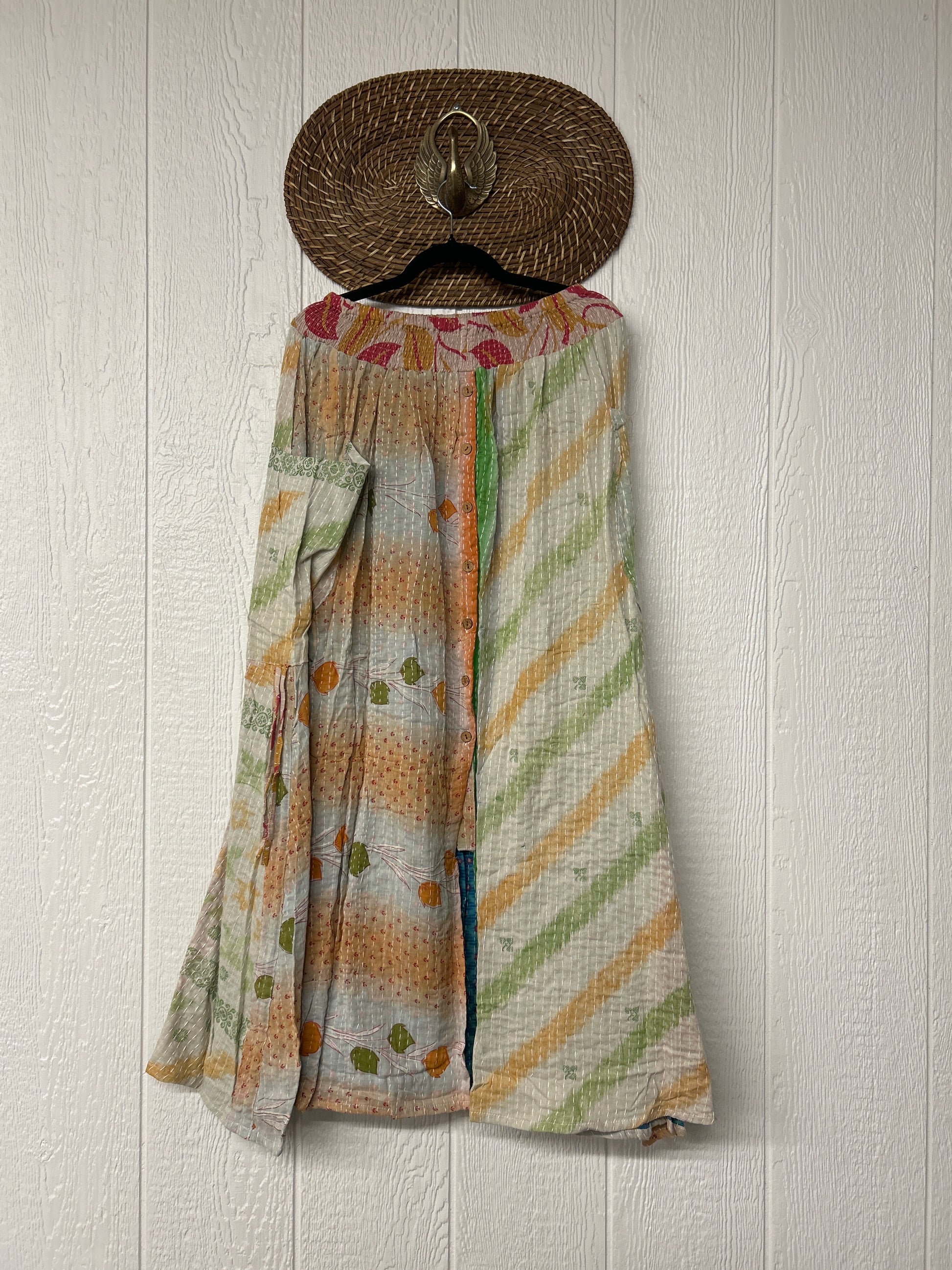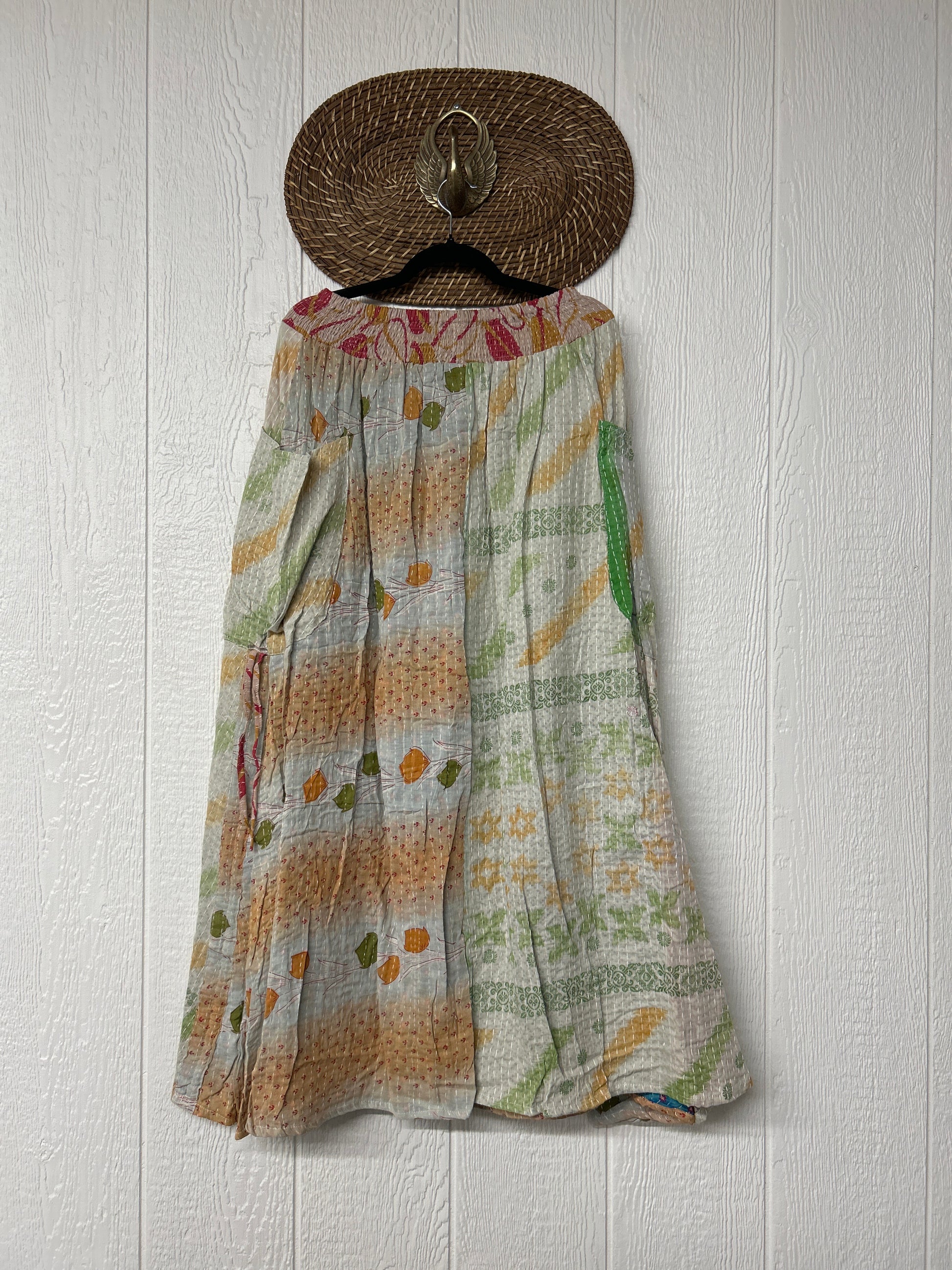 Crafted from kantha stitched vintage cotton sari this absolute dream features slouchy side pockets with a butterfly drawstring to cinch the sides, a button front skirt and a stretchy free size waist.