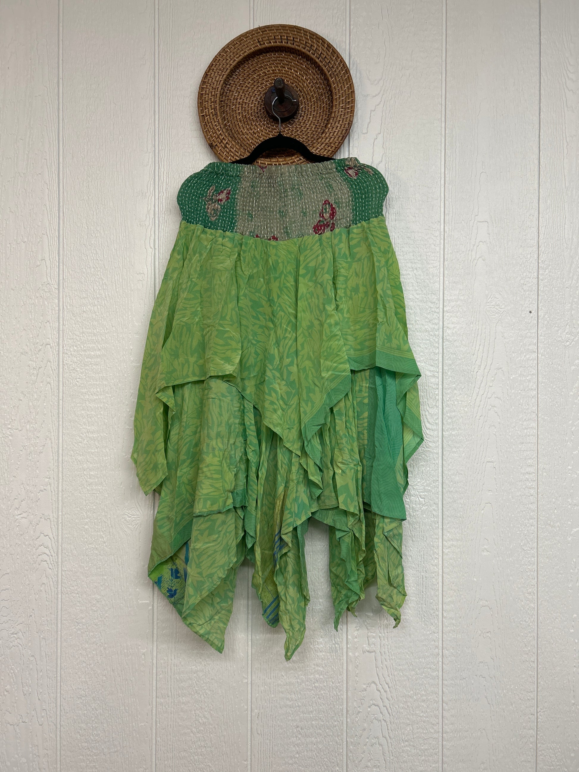 crafted from our ultra lux vintage crepe sari. Features a rock star asymmetrical hem and stretchy waistband. This versatile piece can be pulled up to be worn as a tunic!