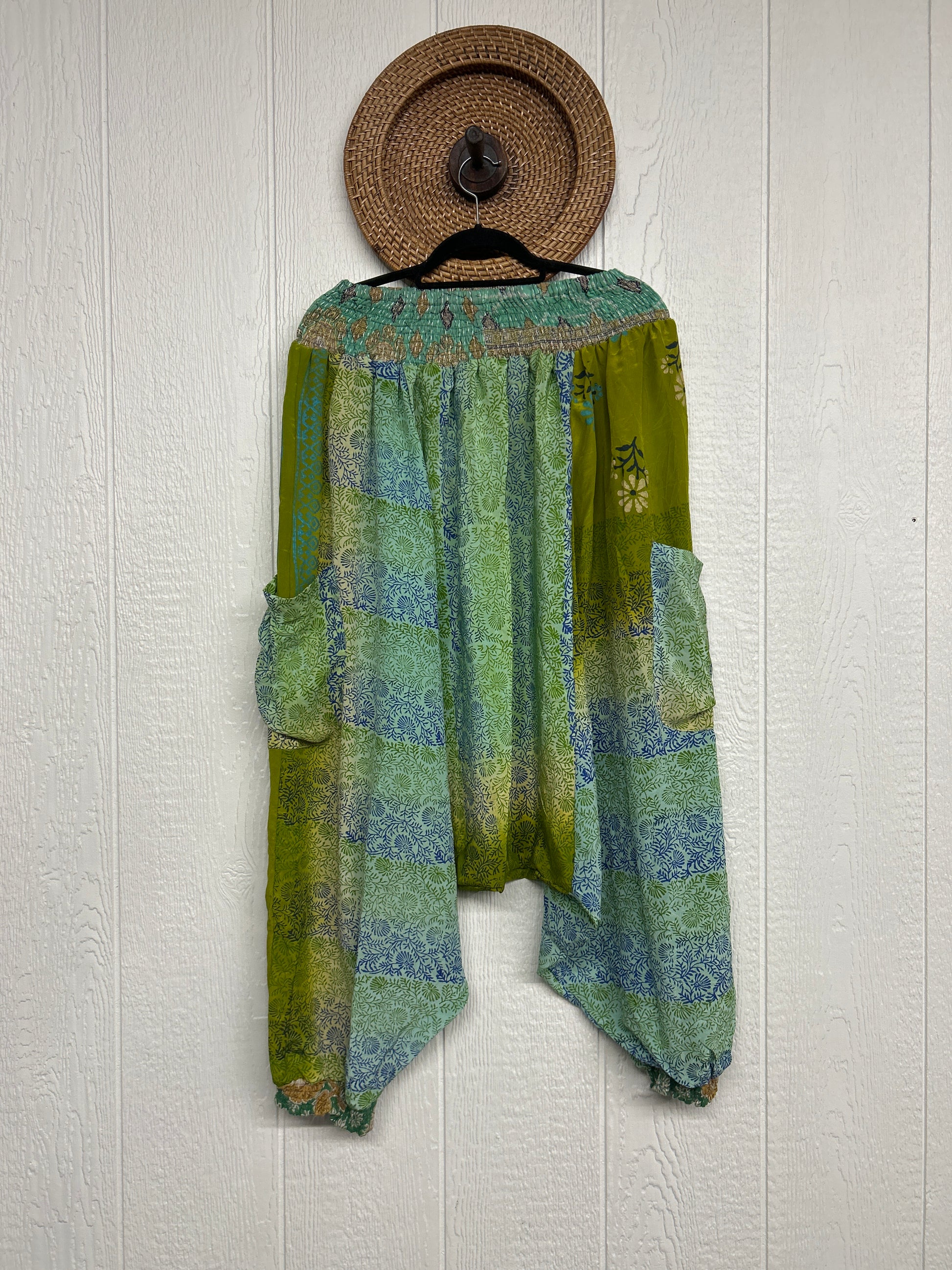 Made from vintage crepe sari, these are perfectly slouchy with a low harem drop for that effortless, flowy feel. Featuring deep side pockets, kantha stretch at the ankles, and a kantha smocked waistband that feels smooth and soft on the skin.