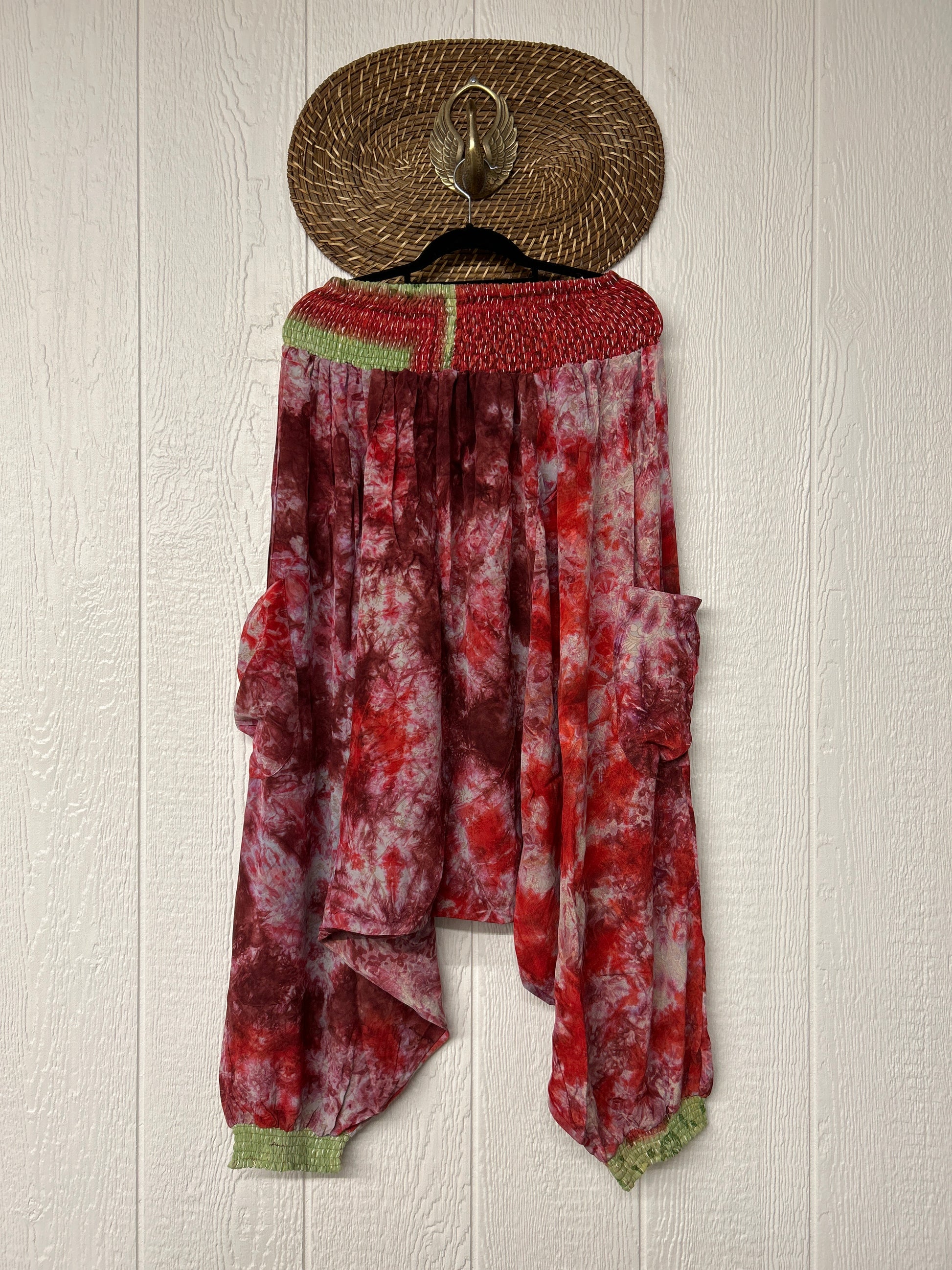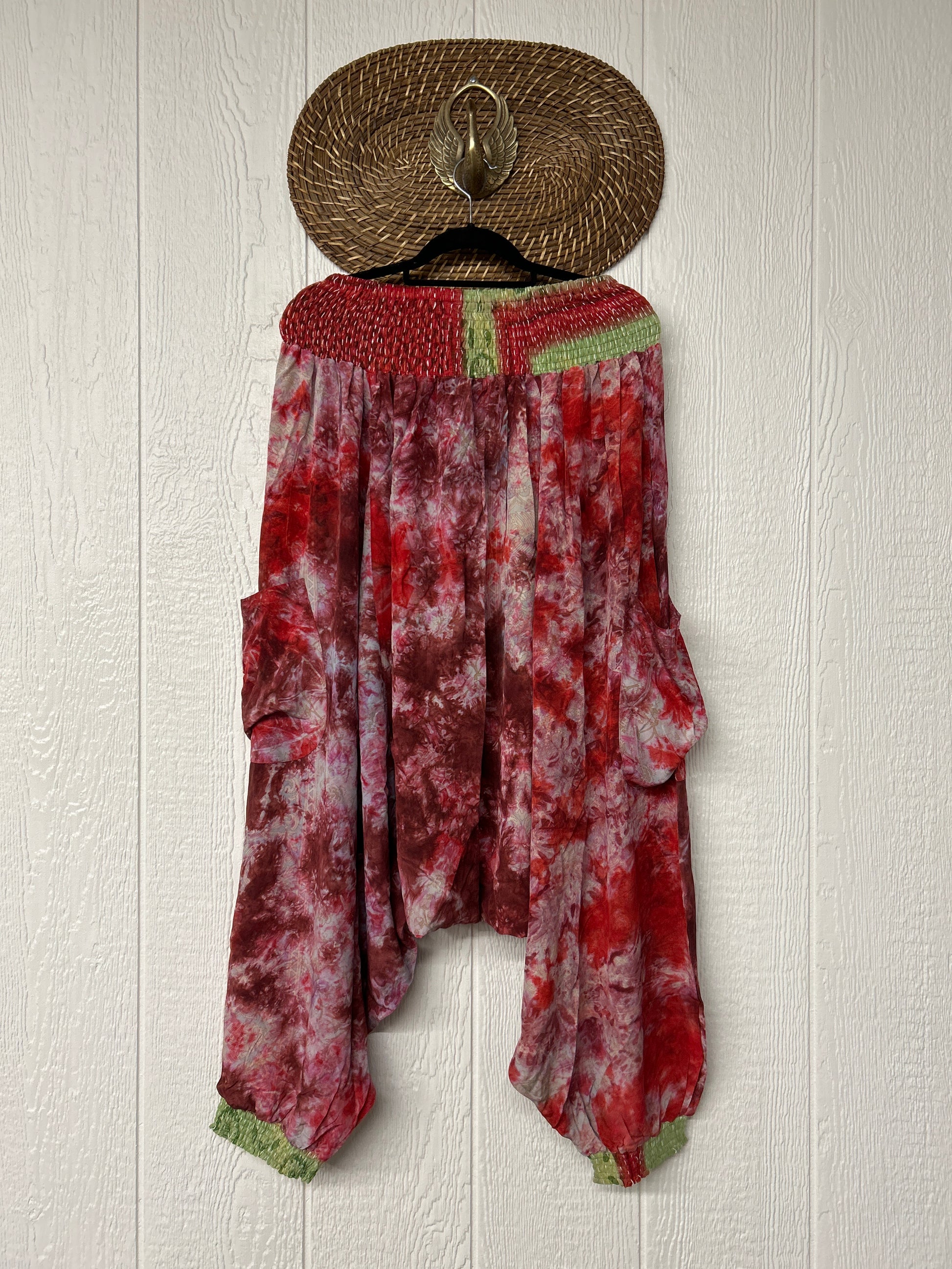 Made from vintage crepe sari, these are perfectly slouchy with a low harem drop for that effortless, flowy feel. Featuring deep side pockets, kantha stretch at the ankles, and a kantha smocked waistband that feels smooth and soft on the skin.