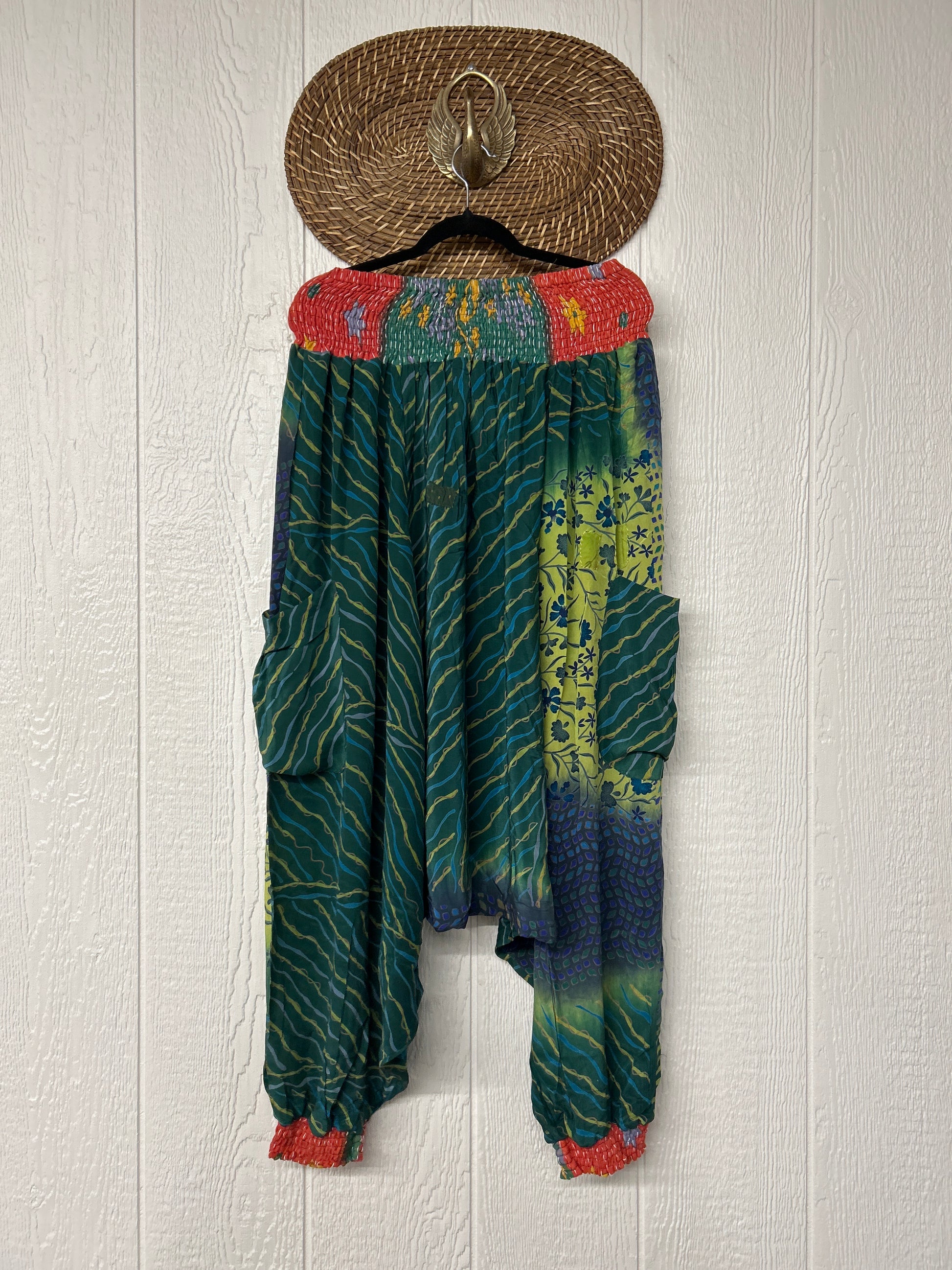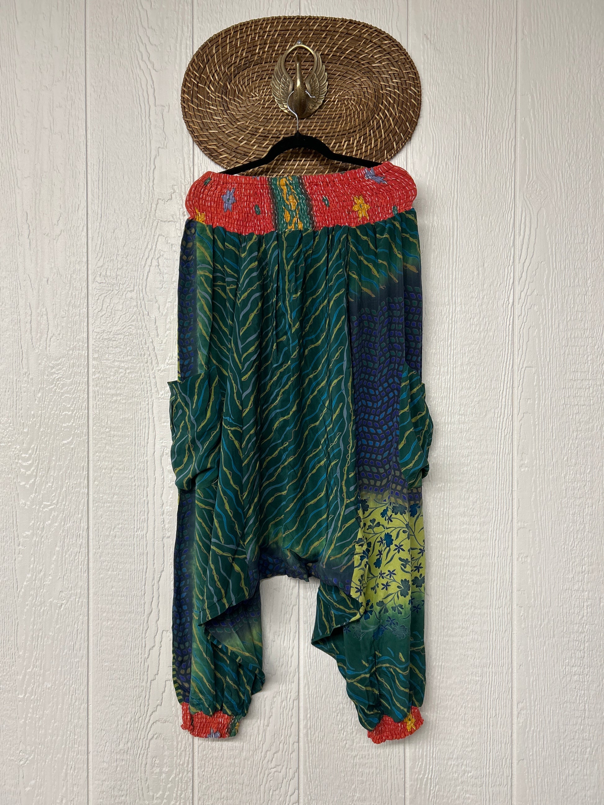 Made from vintage crepe sari, these are perfectly slouchy with a low harem drop for that effortless, flowy feel. Featuring deep side pockets, kantha stretch at the ankles, and a kantha smocked waistband that feels smooth and soft on the skin.