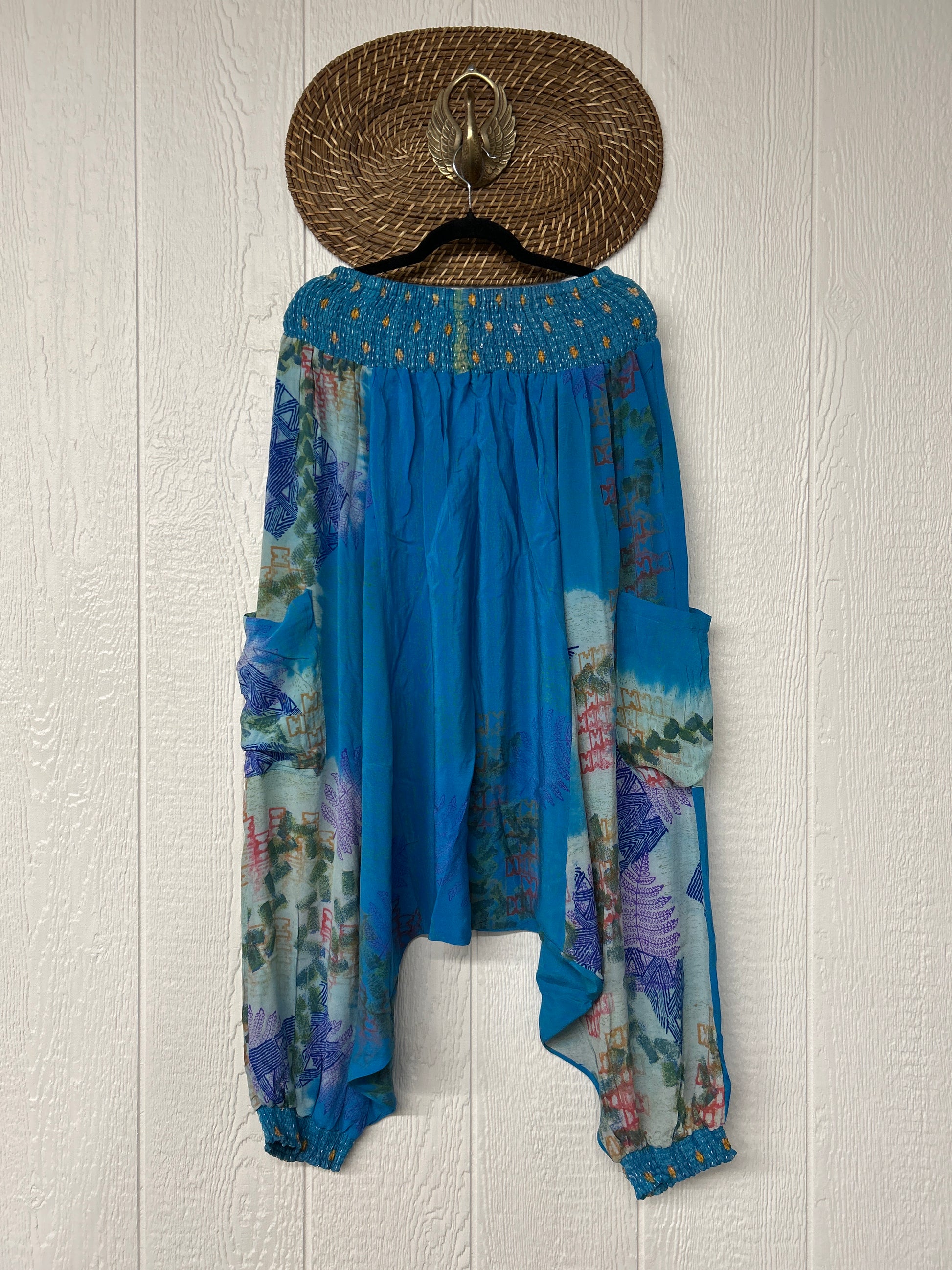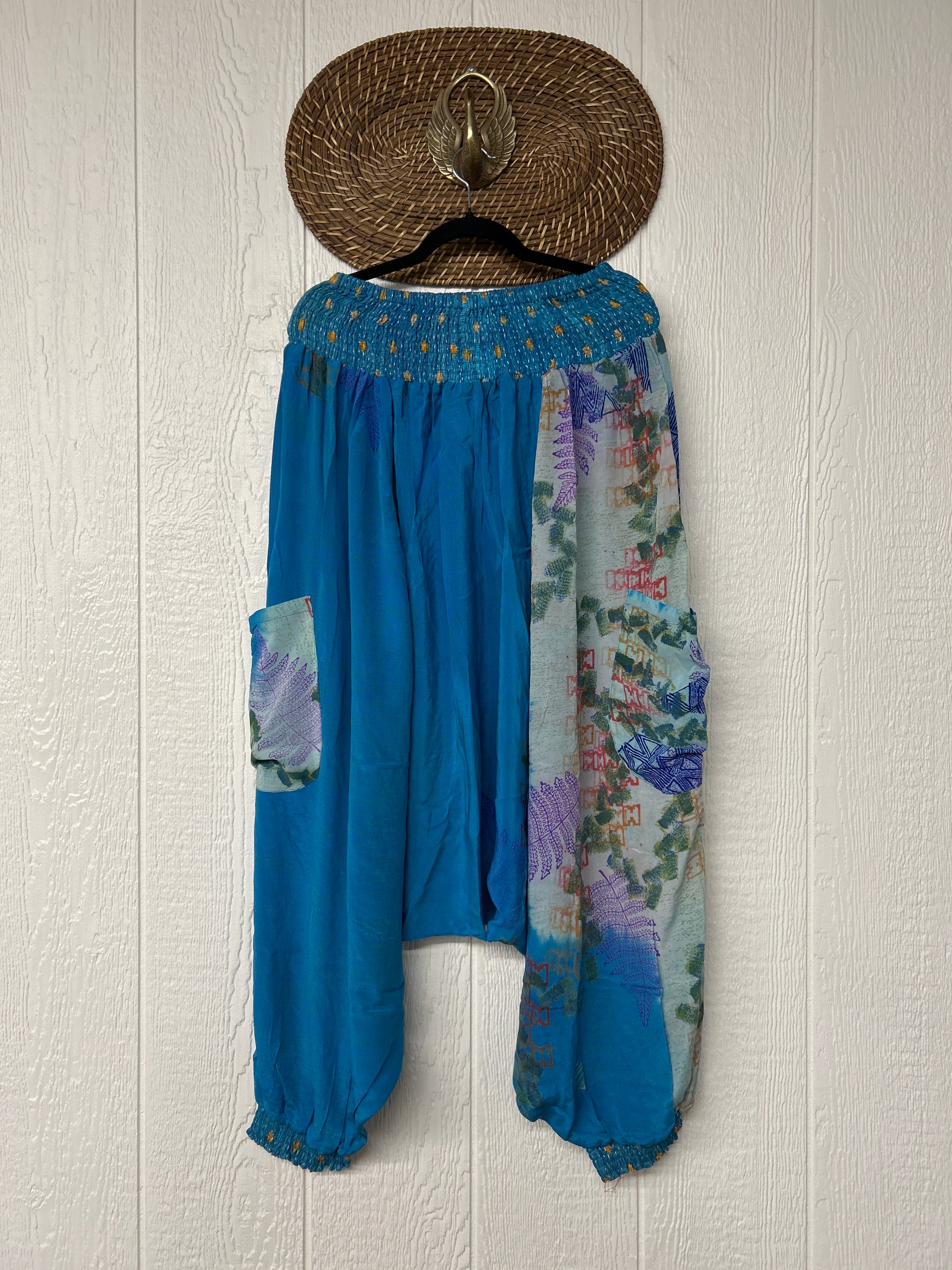 Made from vintage crepe sari, these are perfectly slouchy with a low harem drop for that effortless, flowy feel. Featuring deep side pockets, kantha stretch at the ankles, and a kantha smocked waistband that feels smooth and soft on the skin.