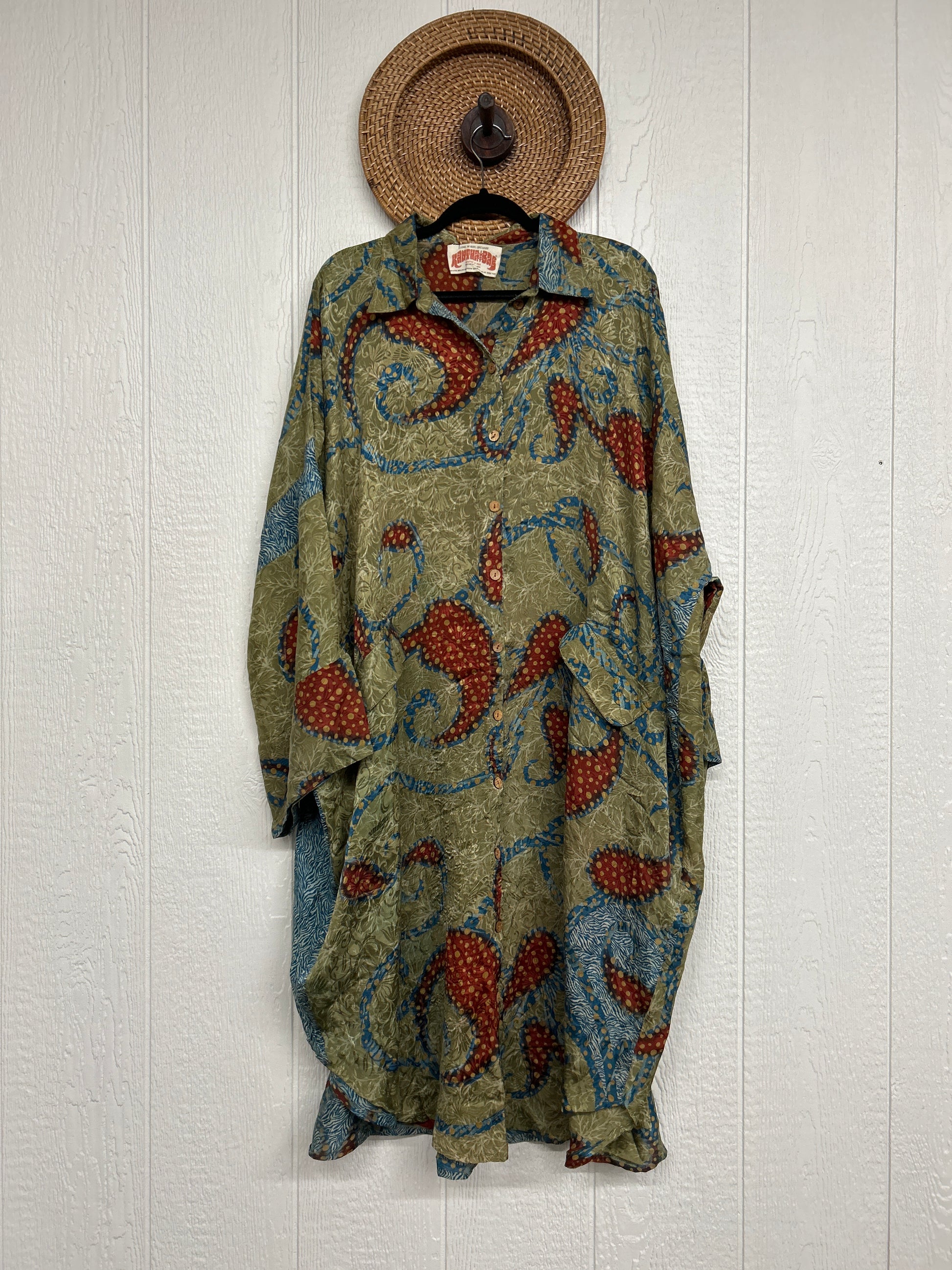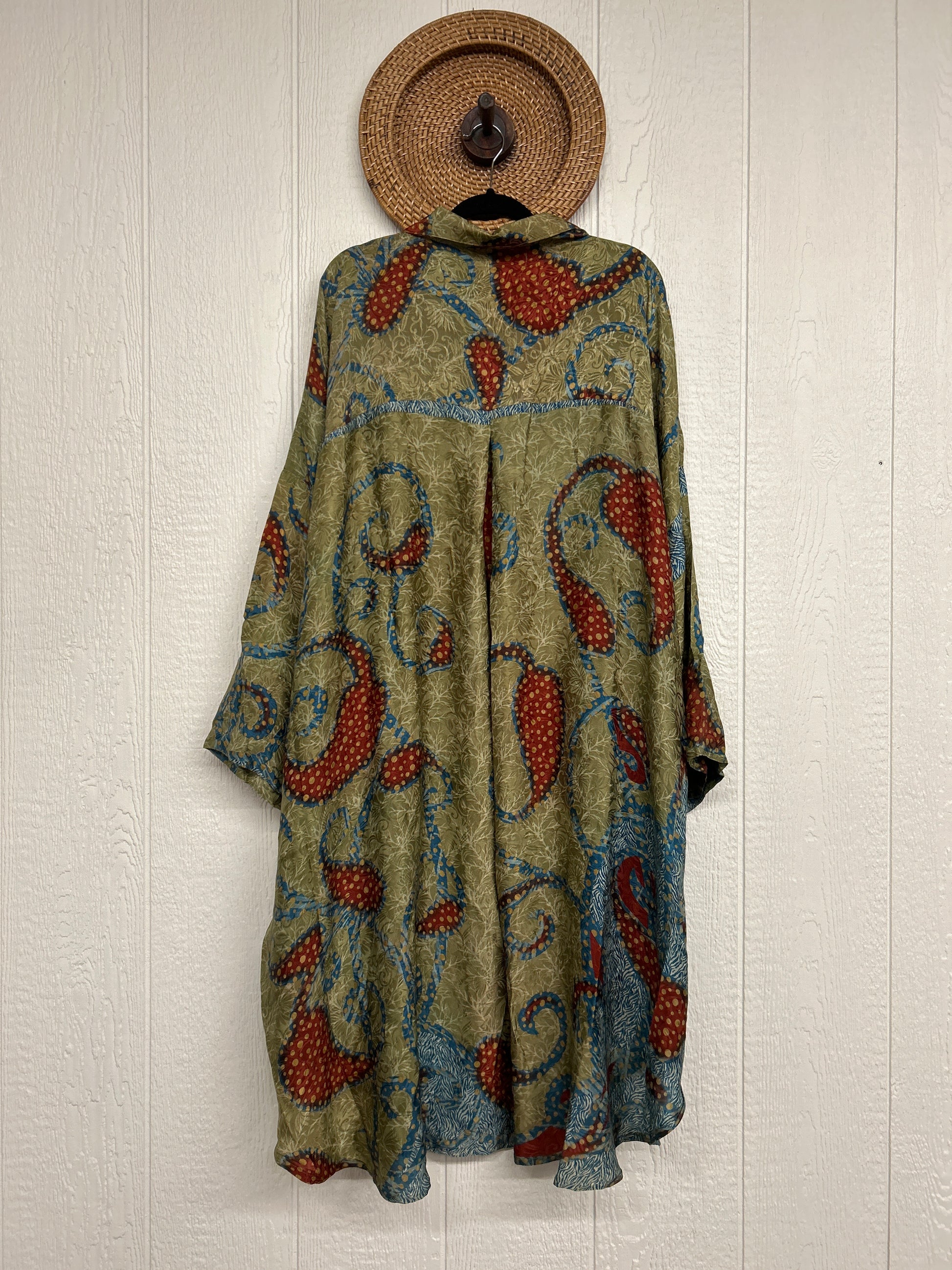 Made from our vintage crepe sari, this billowy dream functional buttons, two deep pockets in the front, dreamy longsleeves and a curved bottom.