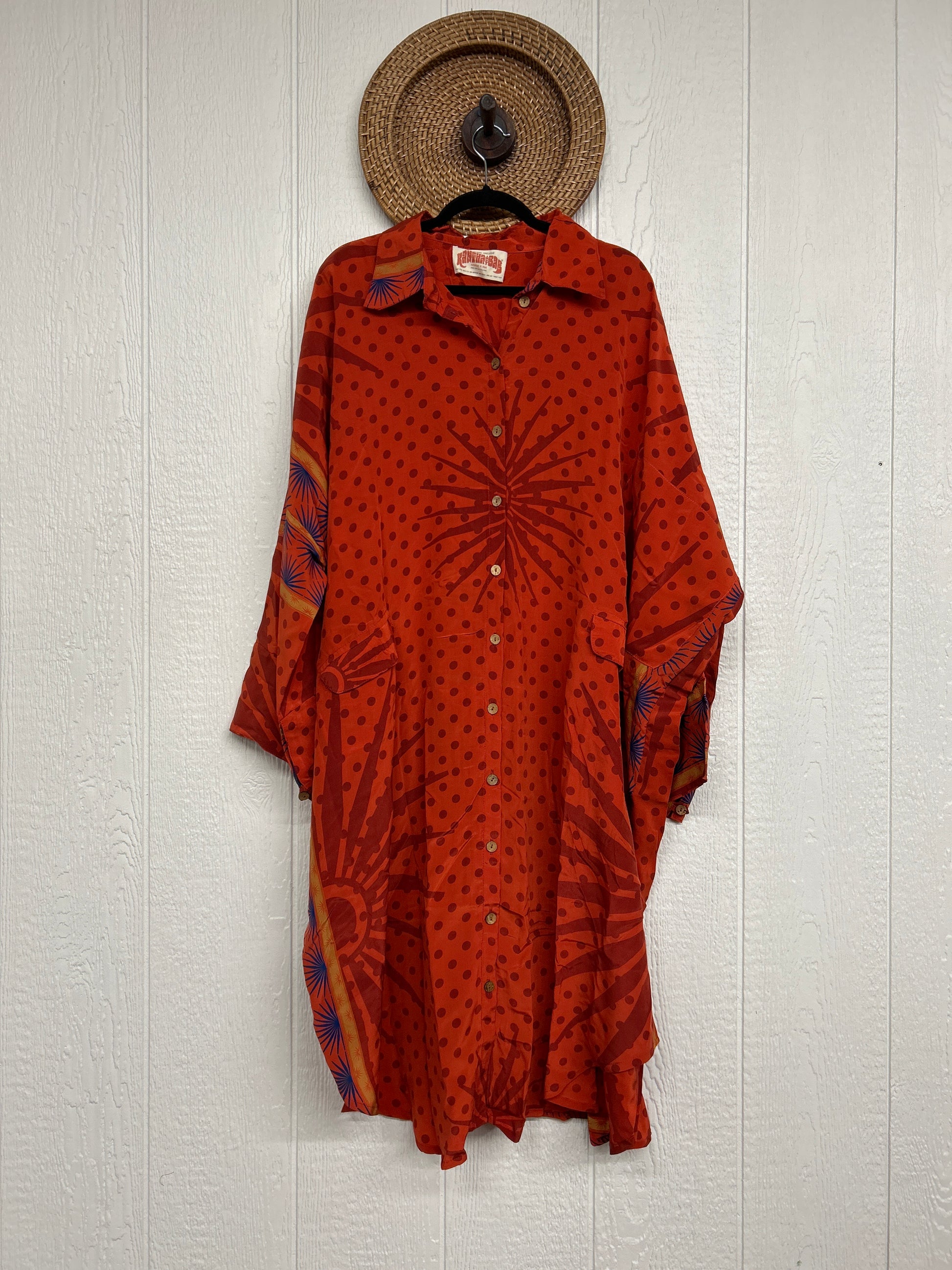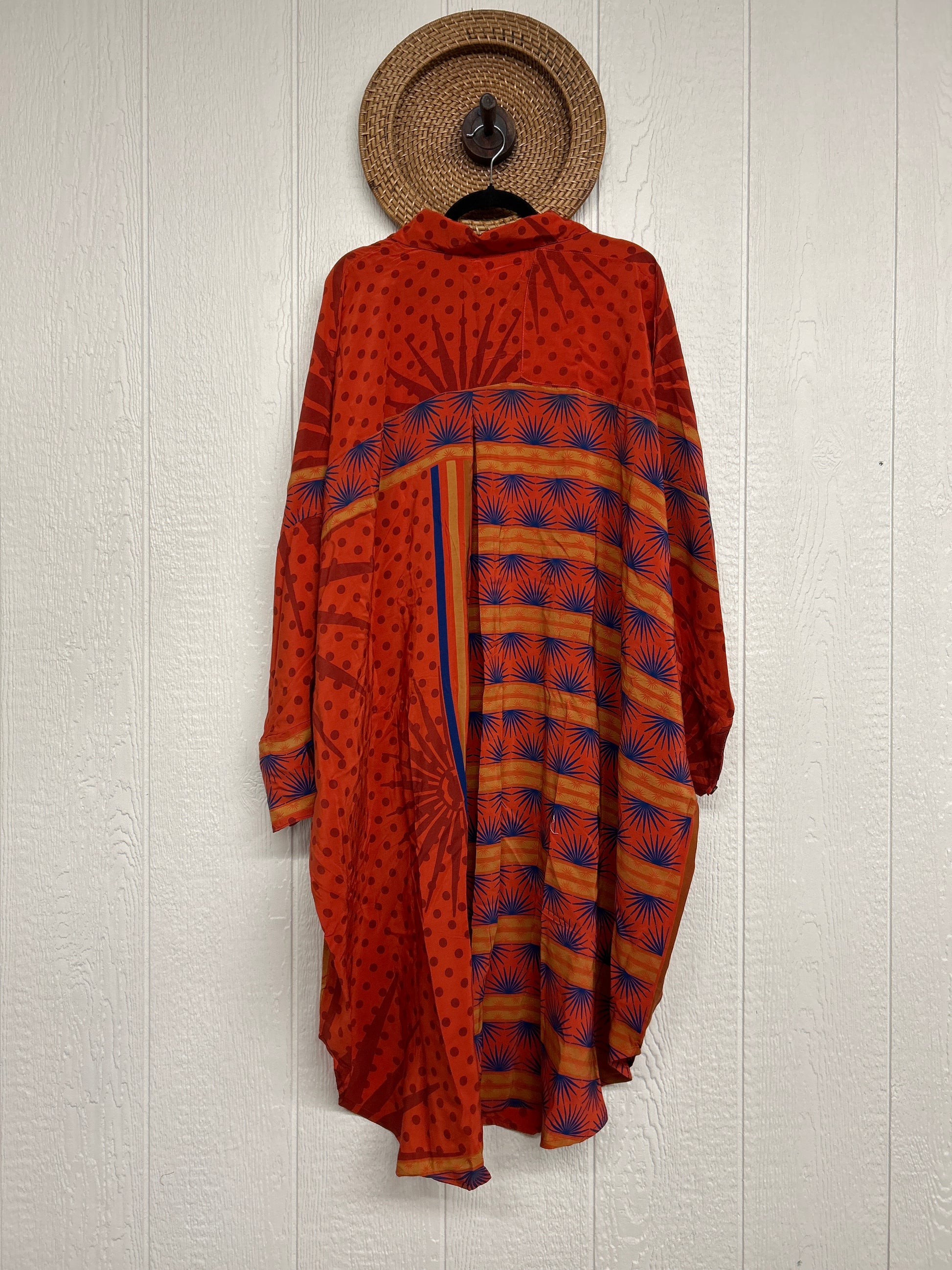 Made from our vintage crepe sari, this billowy dream functional buttons, two deep pockets in the front, dreamy longsleeves and a curved bottom.