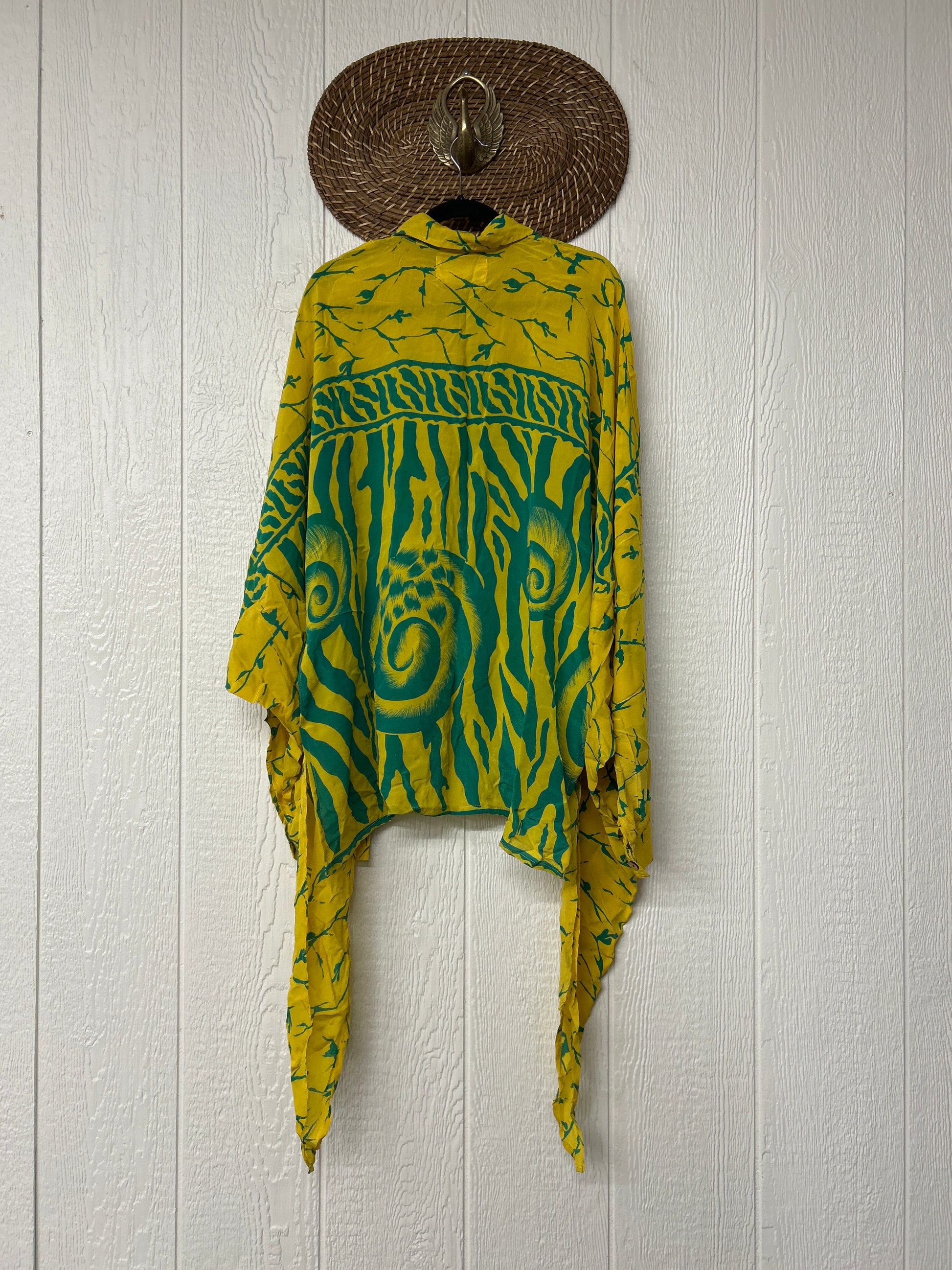 Crafted from our ultra lux vintage crepe sari this floaty dream features a Button-down placket with a high low hem, collar, and button cuffs.