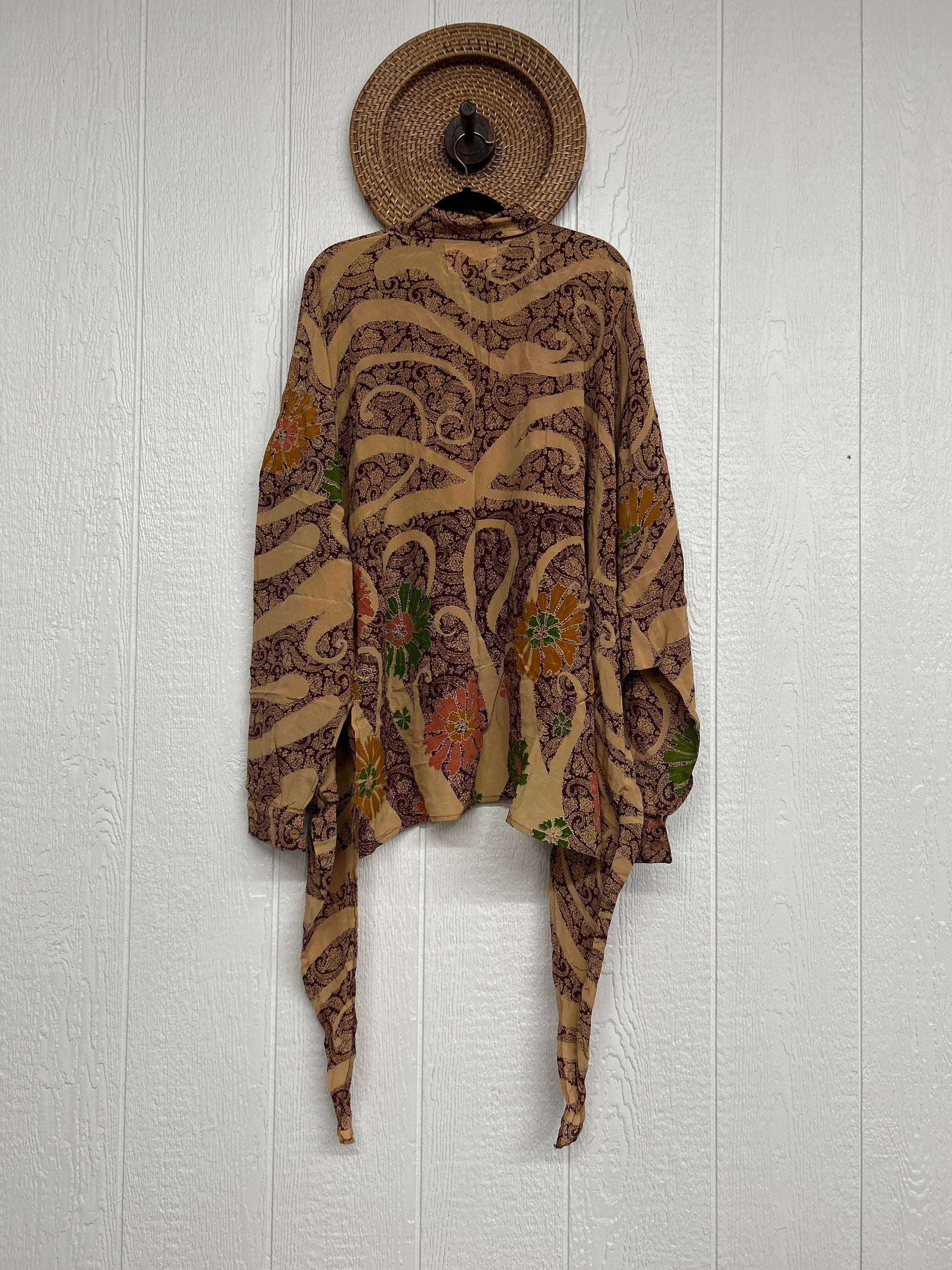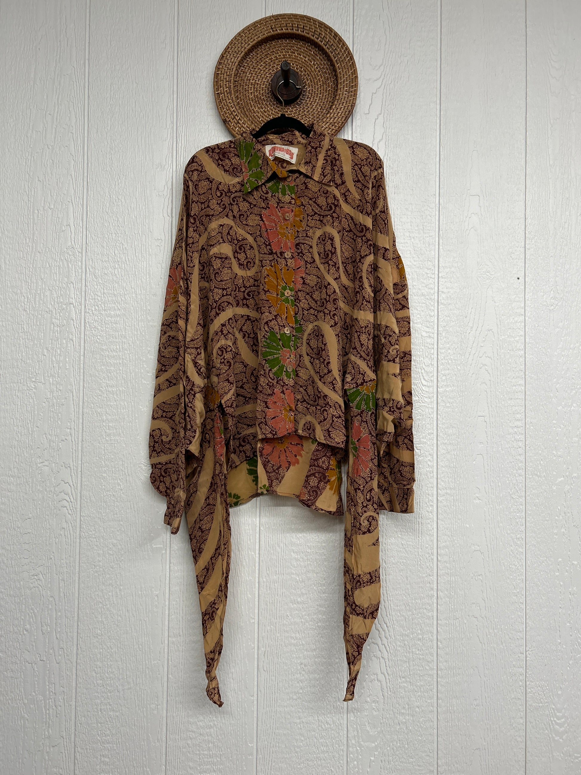 Crafted from our ultra lux vintage crepe sari this floaty dream features a Button-down placket with a high low hem, collar, and button cuffs.
