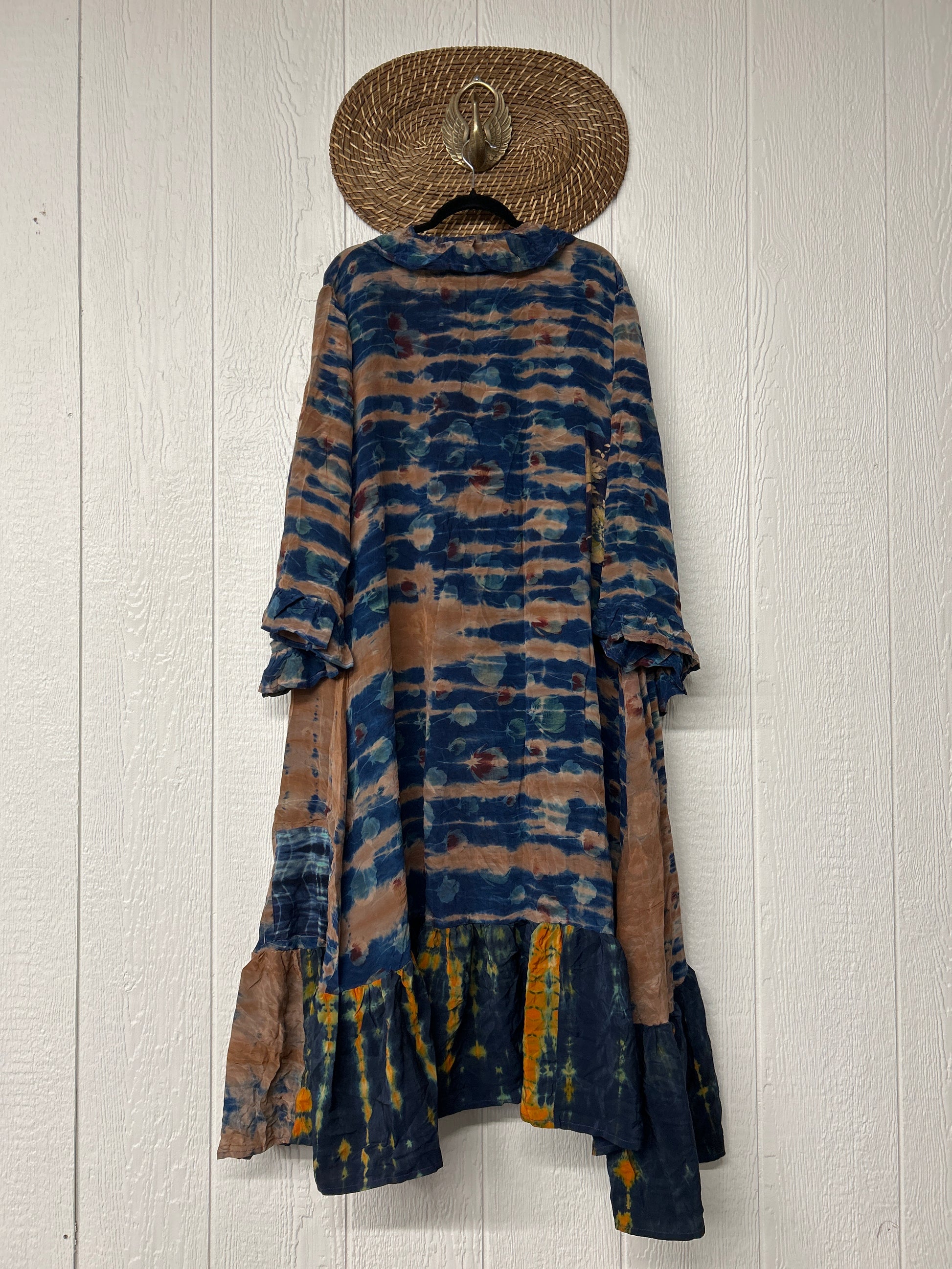 Our pixie duster is pure magic! crafted from ultra lux vintage crepe sari this ethereal layer features ruffles all the way around the outer hem, bell sleeves, double tie closure & high low hem for extra dimension size recommended 00-22/24