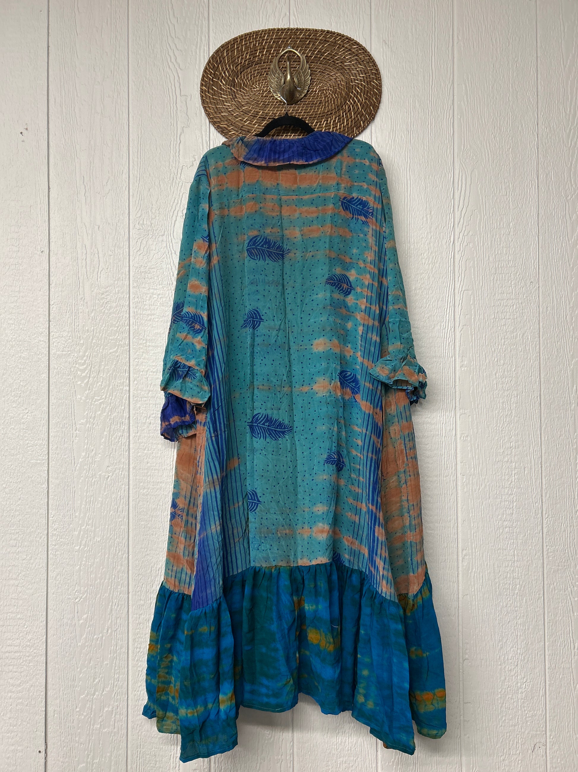 Our pixie duster is pure magic! crafted from ultra lux vintage crepe sari this ethereal layer features ruffles all the way around the outer hem, bell sleeves, double tie closure & high low hem for extra dimension size recommended 00-22/24 Crafted and sewn by families in a small village in Northern India providing work and a fair living. This product should be hand washed and line dried for longest life. For softness, fluff in the dryer on low heat after it has dried from hand washing. Disclosure: Our vintage styles have lived a full life before becoming the designs in our shop. Fabrics may have small threads or holes in the layers. Color inconsistency or small stains may be present. The saris are sewn together and extend the life of each design. Imperfections should be celebrated.