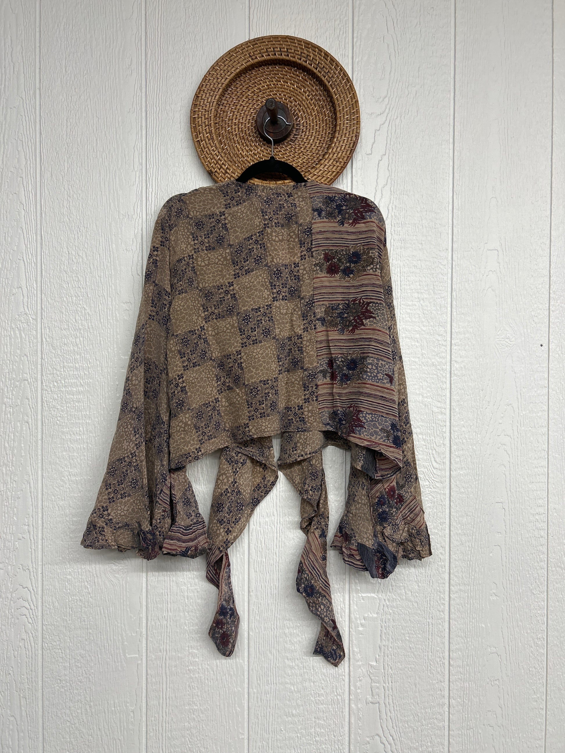 Crafted from vintage crepe sari this floaty layer features bounce bell sleeves and a tie closure long enough to wrap around your body. We know this will be one of your new favorites.