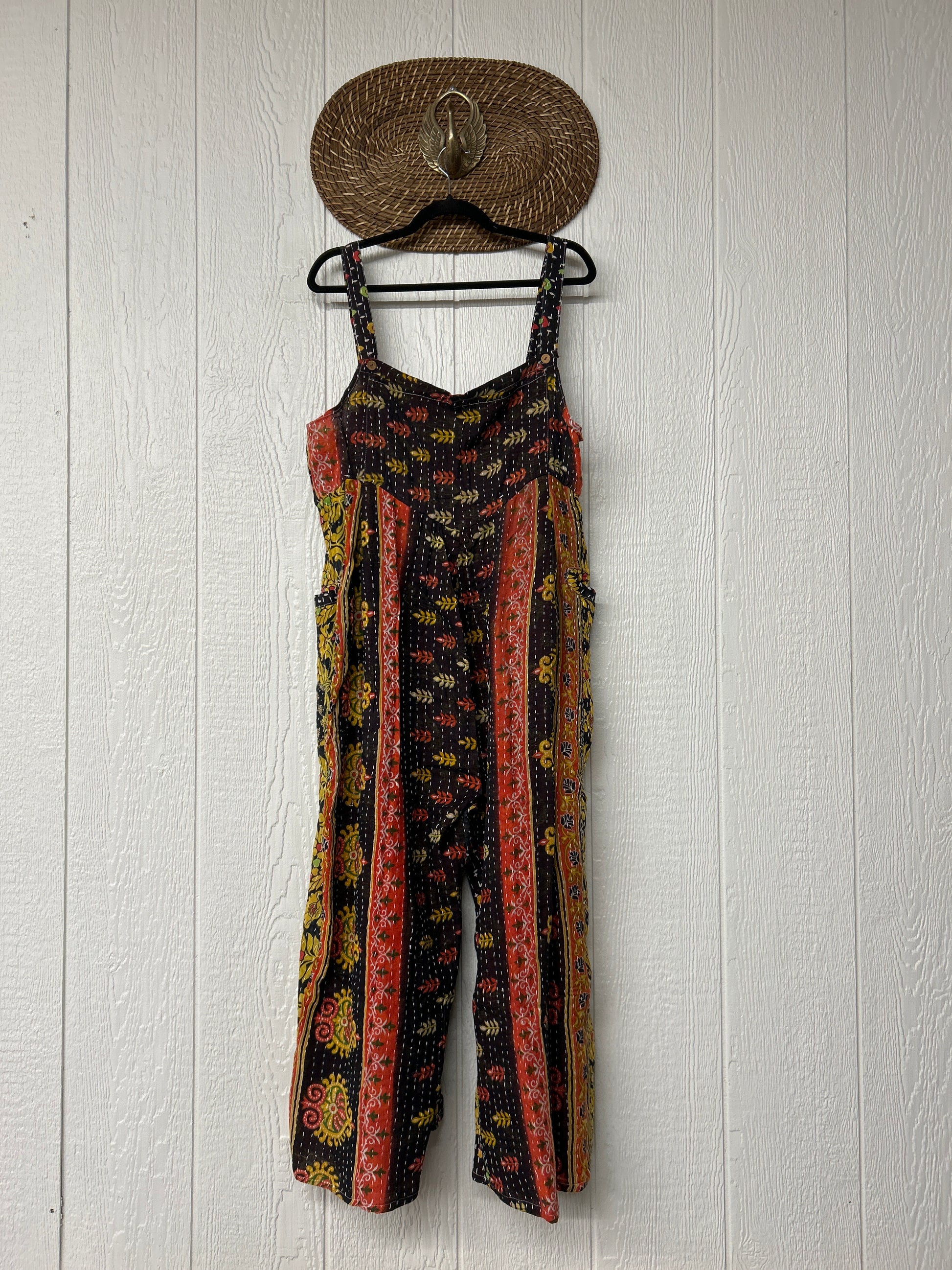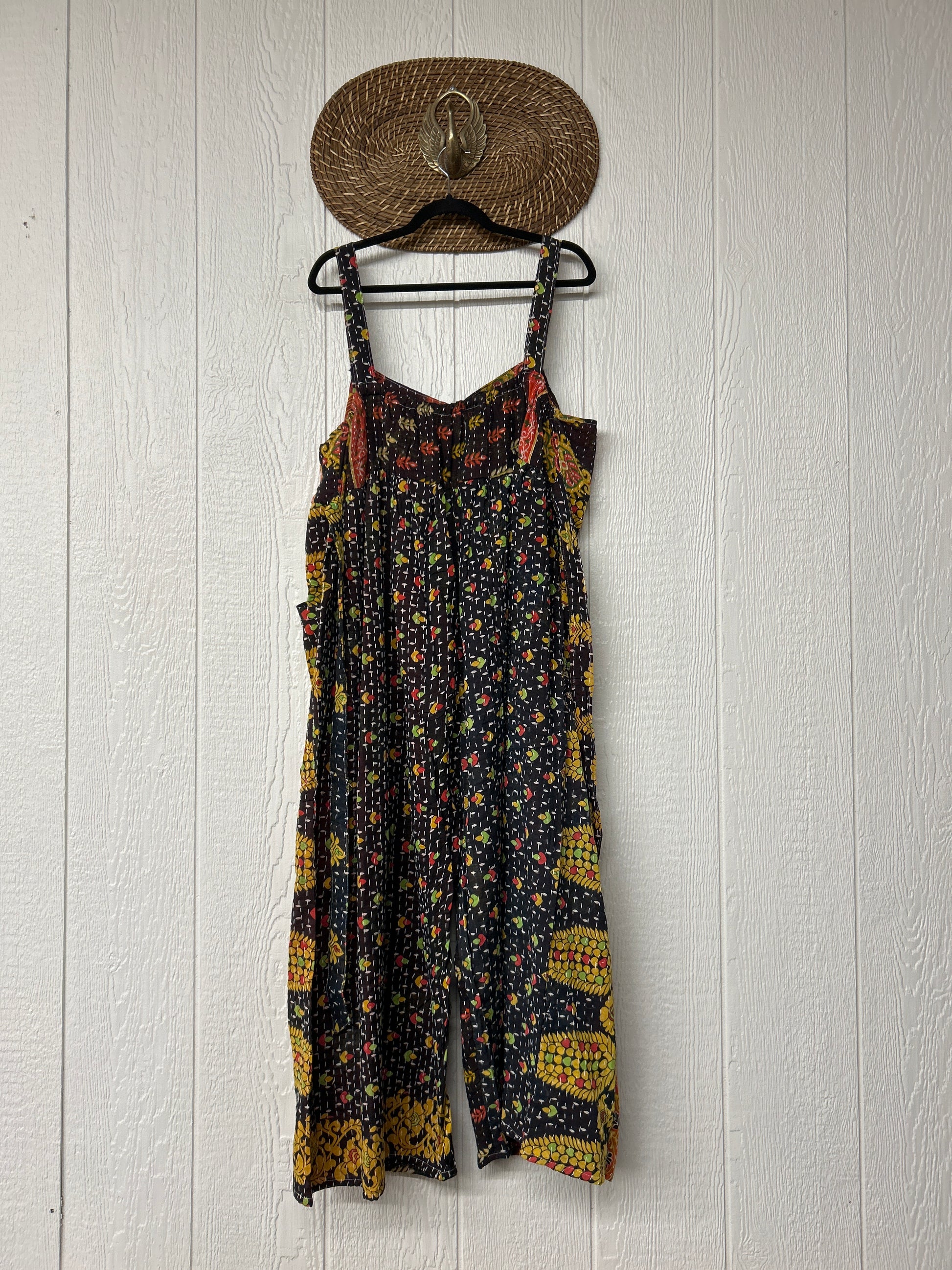 Features adjustable button straps, deep interior pockets, front bib pocket and wide flowy legs