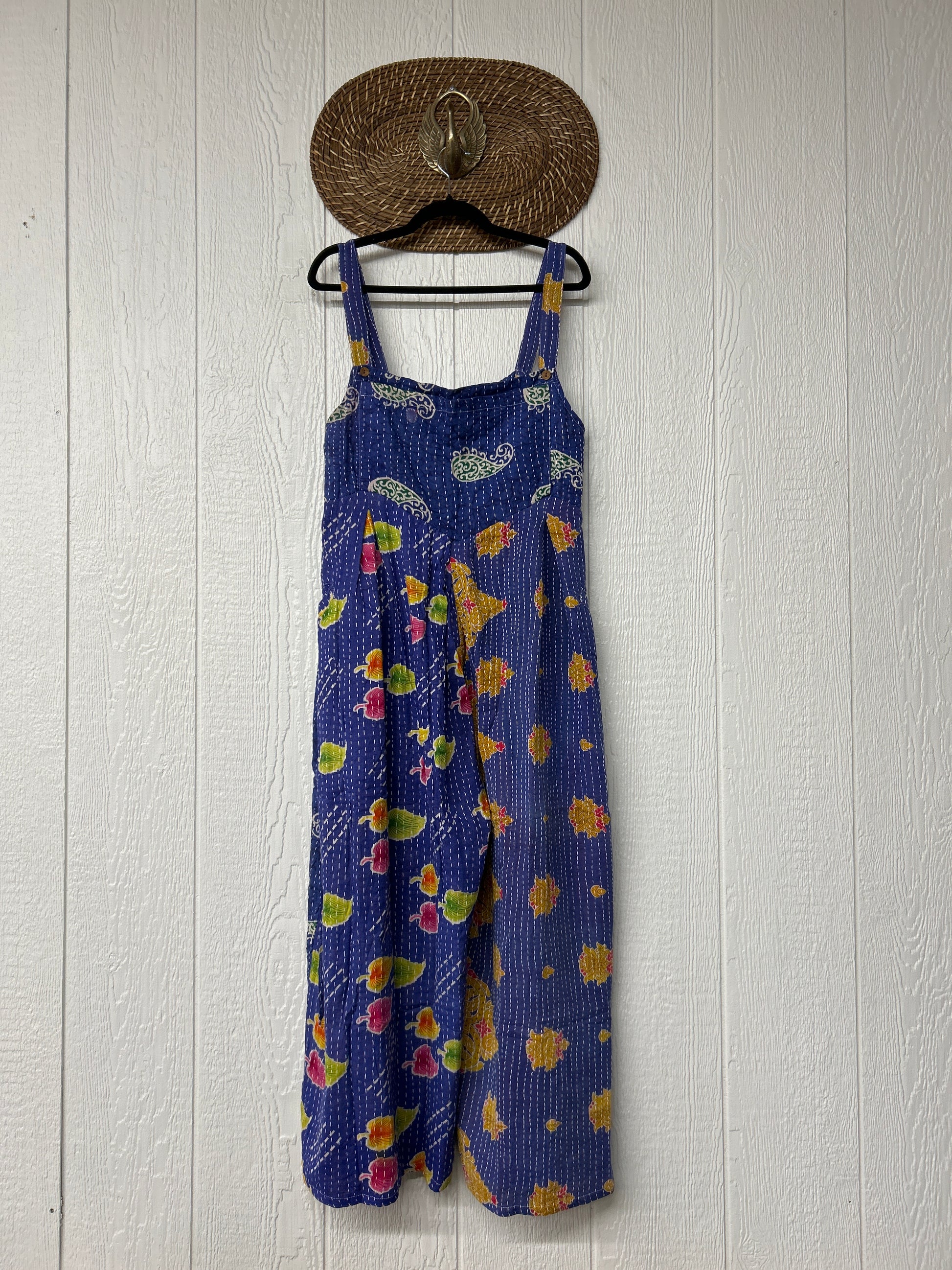 Features adjustable button straps, deep interior pockets, front bib pocket and wide flowy legs