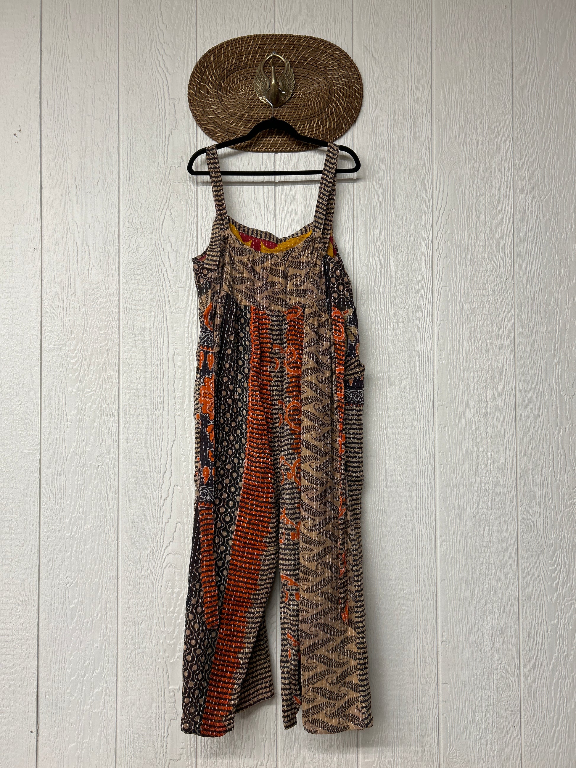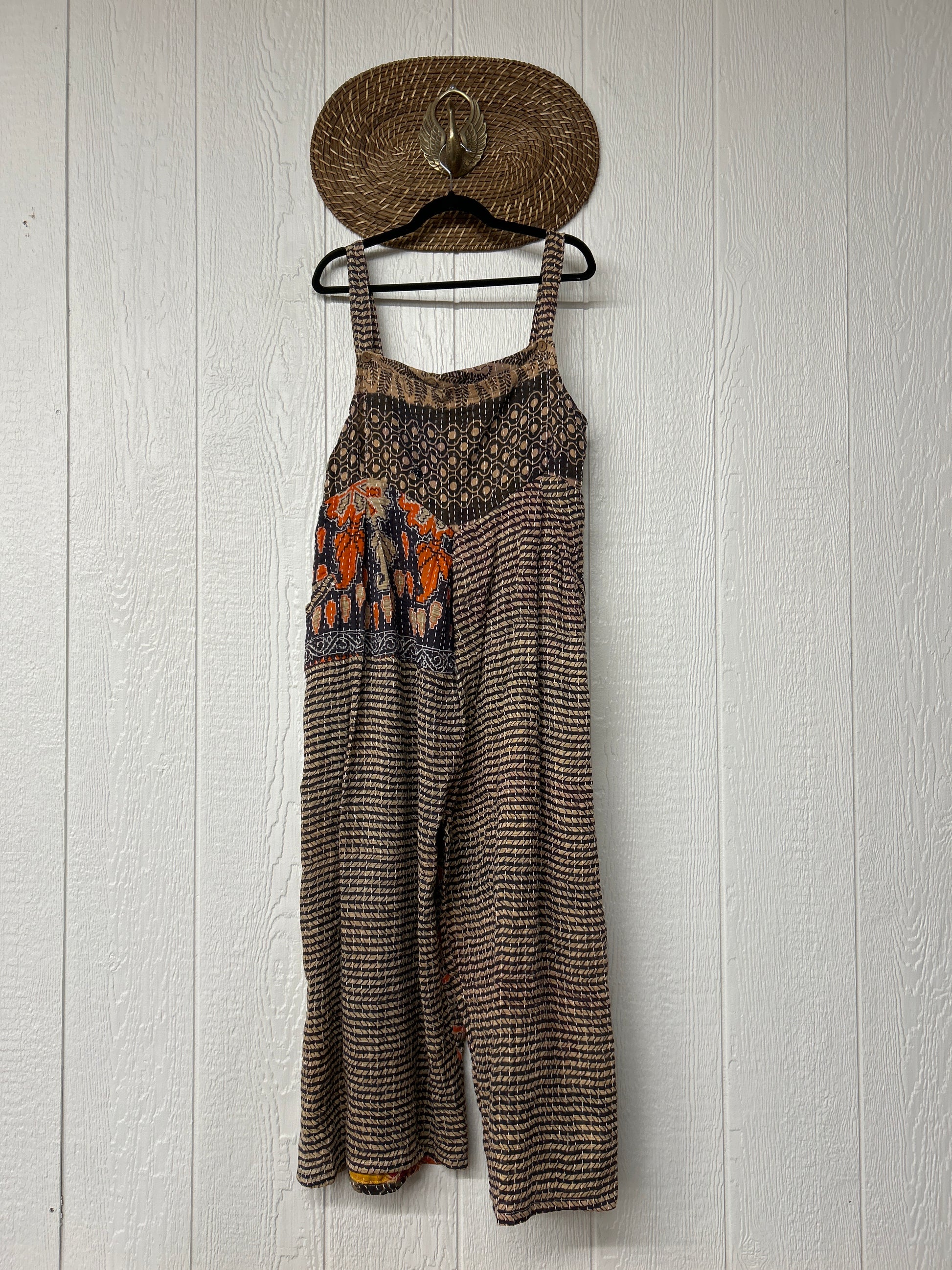 Features adjustable button straps, deep interior pockets, front bib pocket and wide flowy legs