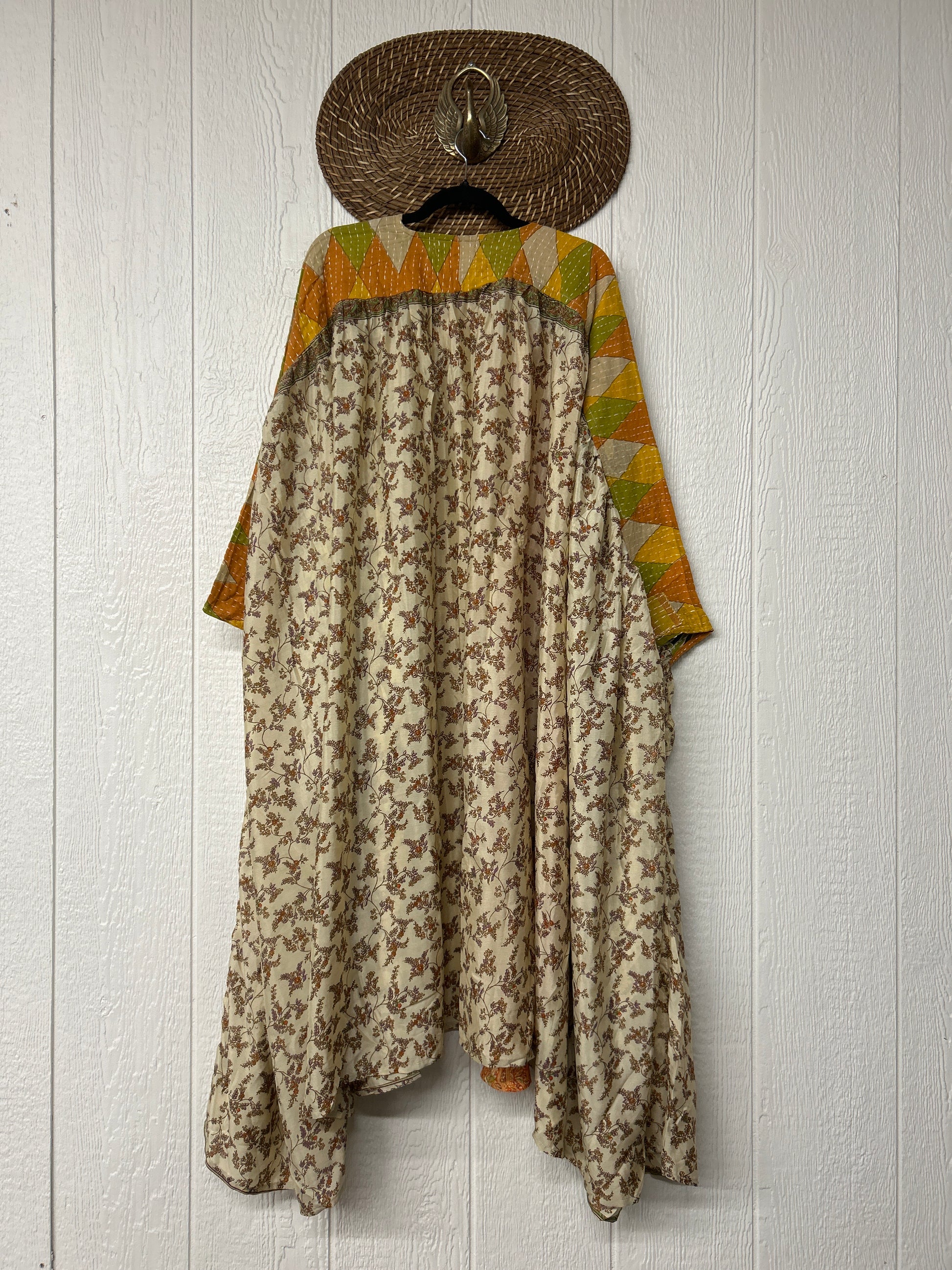 Twirl around to your heart's delight in our new Fleetwood Kimono. This floaty dream is a divine mix of our ultra lux Kantha embroidered vintage cotton and rasgulla sari. Features a tie neck closure and slouchy exterior pockets.