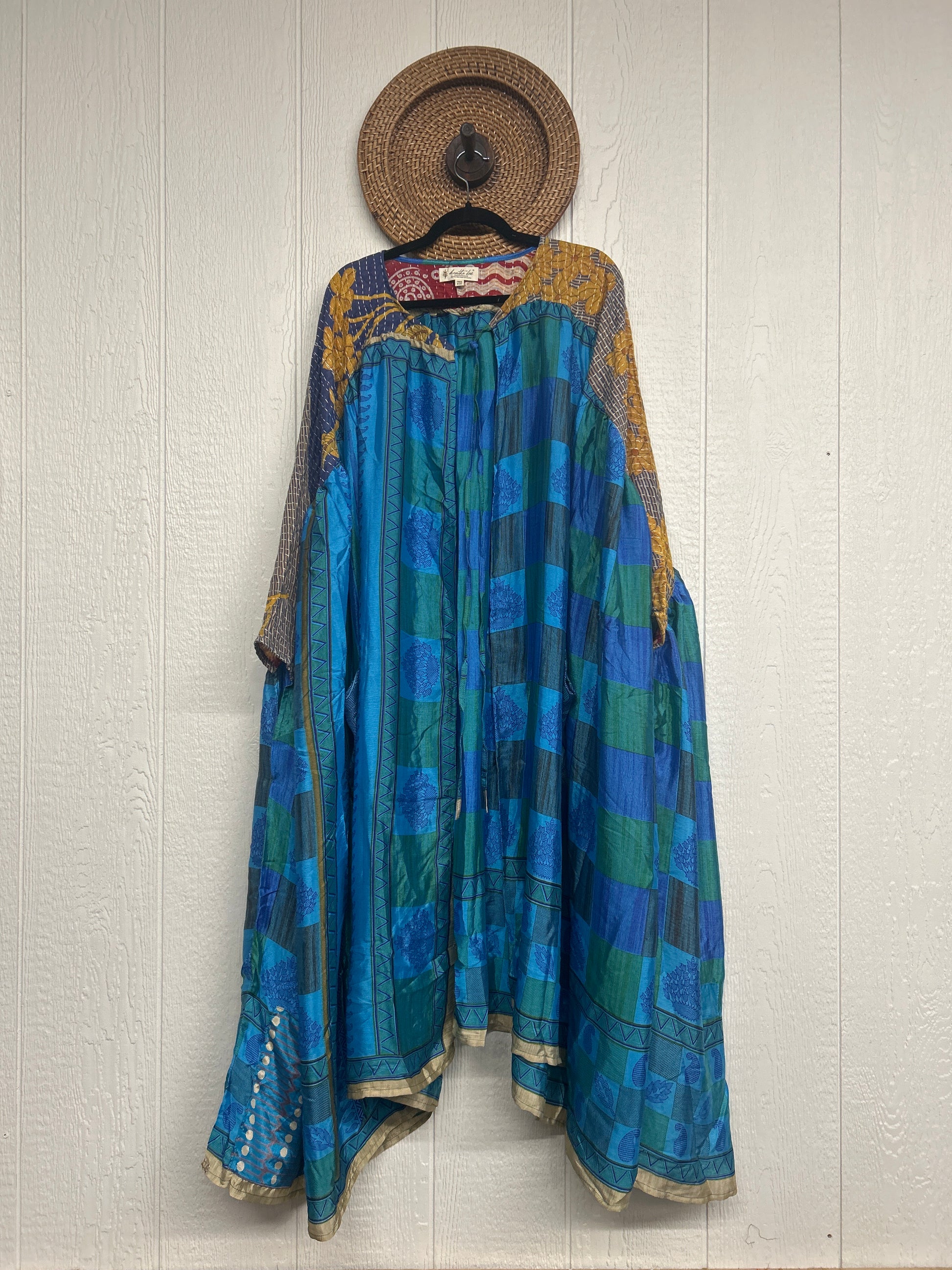 Twirl around to your heart's delight in our new Fleetwood Kimono. This floaty dream is a divine mix of our ultra lux Kantha embroidered vintage cotton and rasgulla sari. Features a tie neck closure and slouchy exterior pockets.