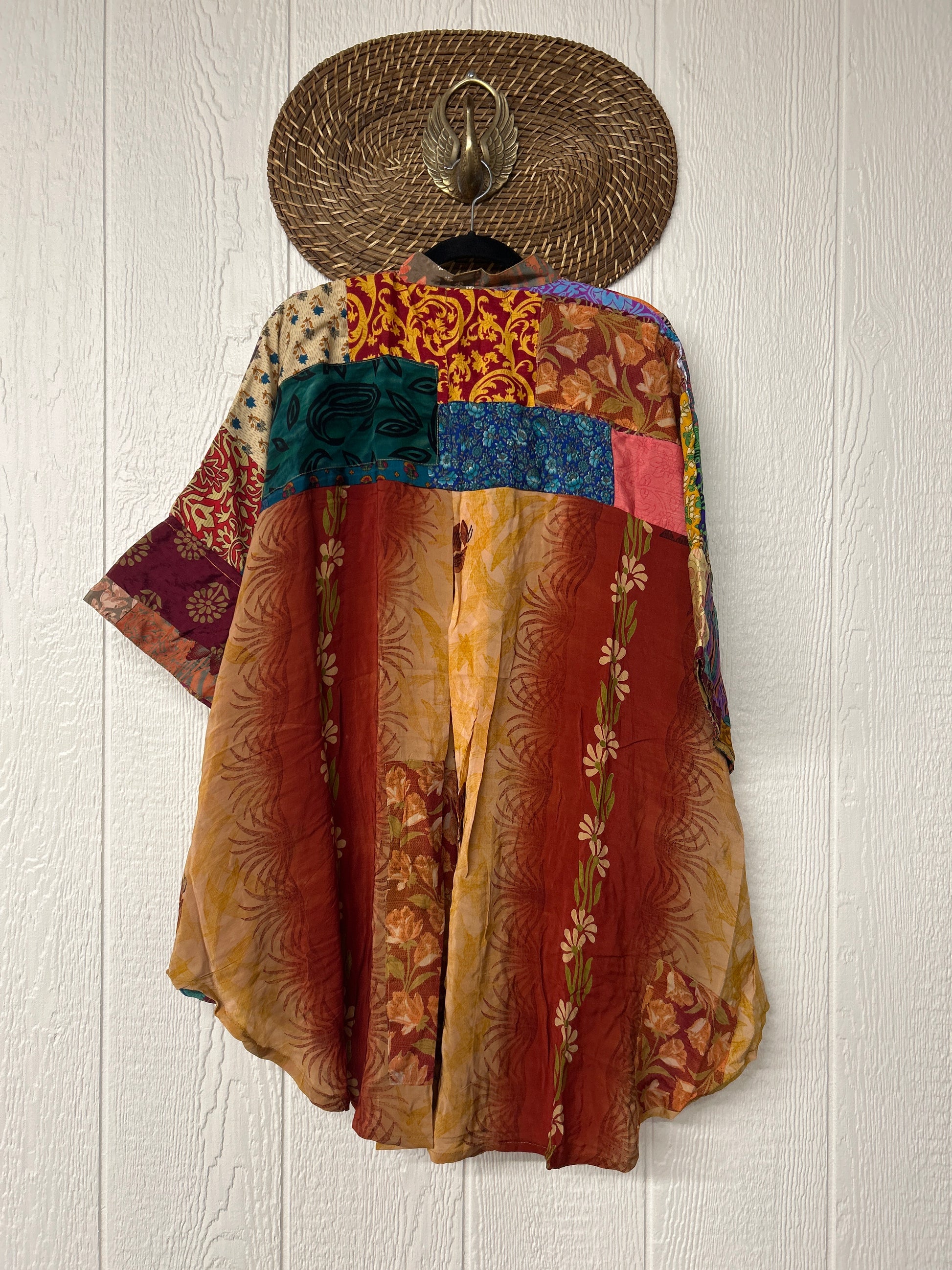 Made from hand-stitched patchwork vintage crepe sari, this billowy dream is fully lined in the front with cotton sari. Features a crepe panel in the back, functional buttons, two slouchy pockets in the front, and a curved bottom.