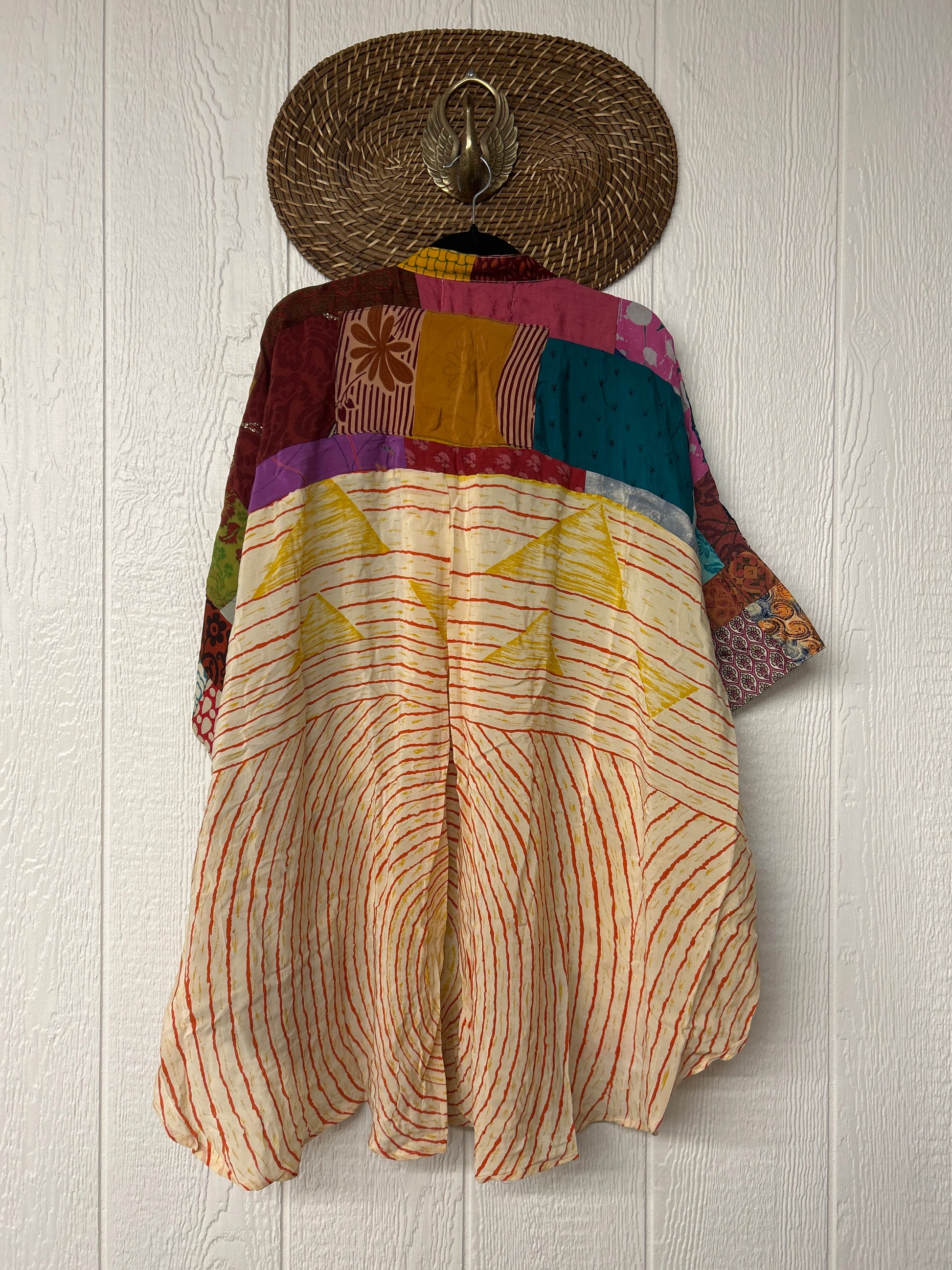Made from hand-stitched patchwork vintage crepe sari, this billowy dream is fully lined in the front with cotton sari. Features a crepe panel in the back, functional buttons, two slouchy pockets in the front, and a curved bottom.