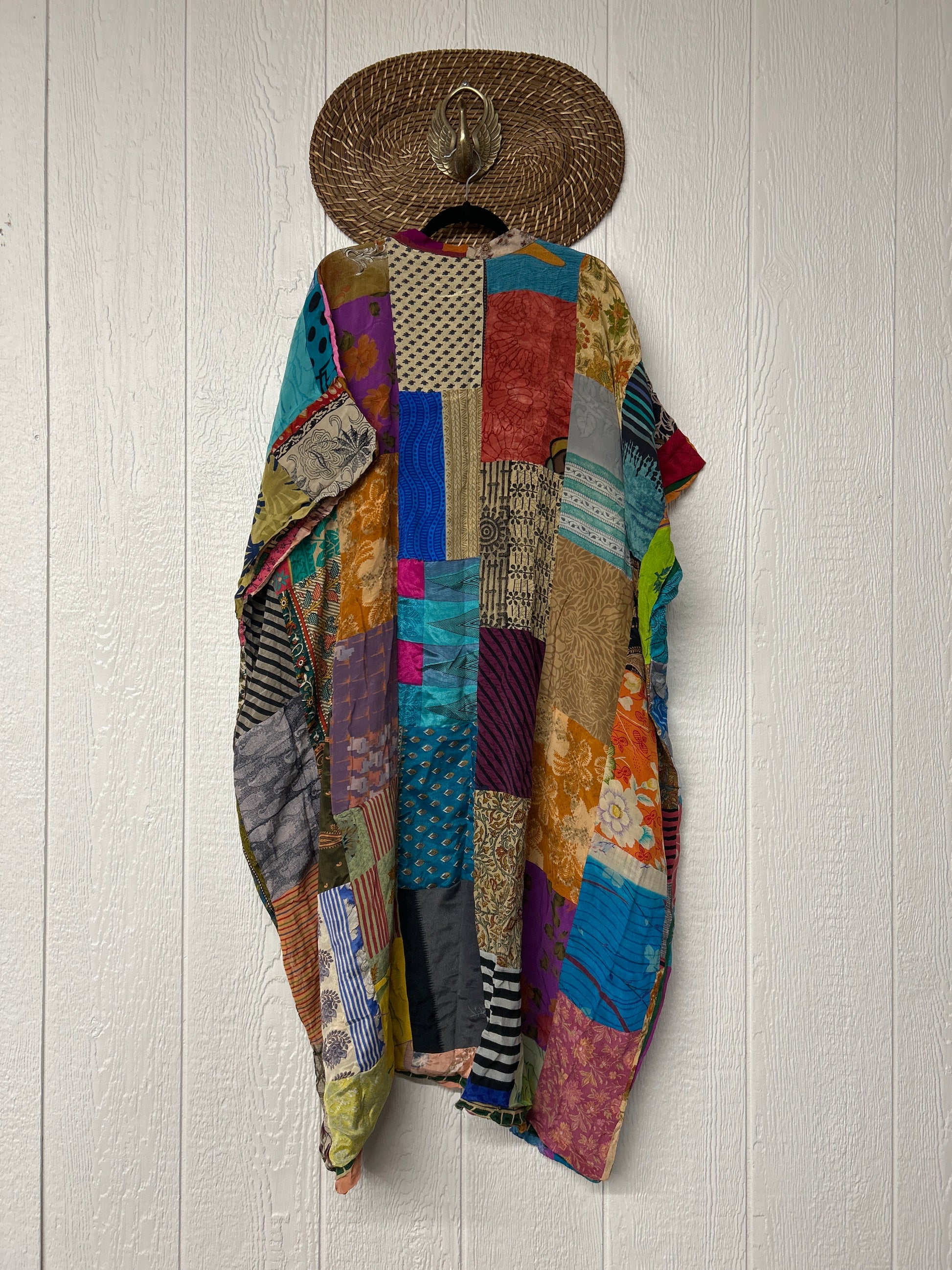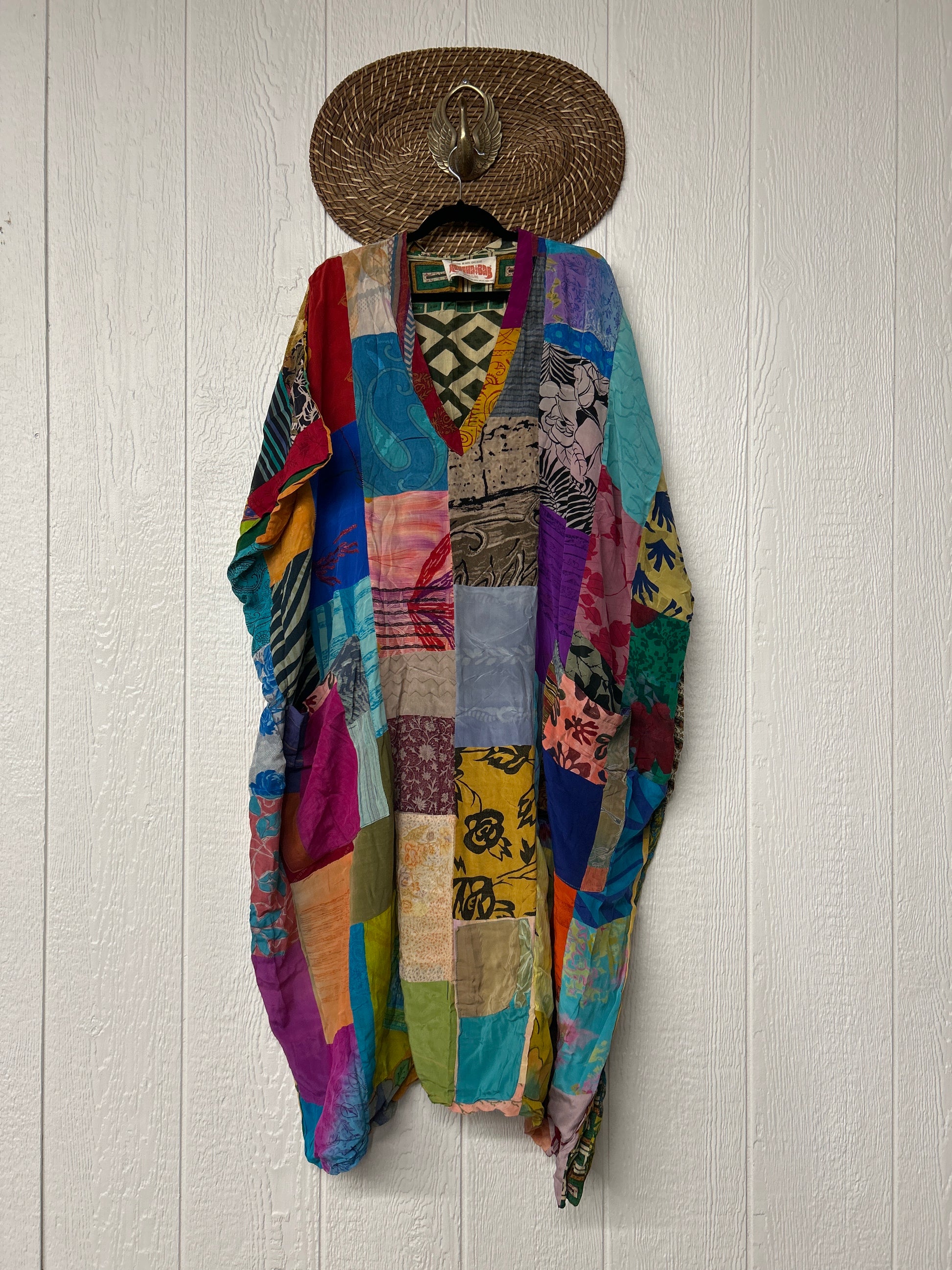 Patchwork outer garment is made from upcycled vintage rasgulla and crepe and fully lined in printed cotton sari. Features slouchy outer pockets, a v neckline and side slits for extra dimension.