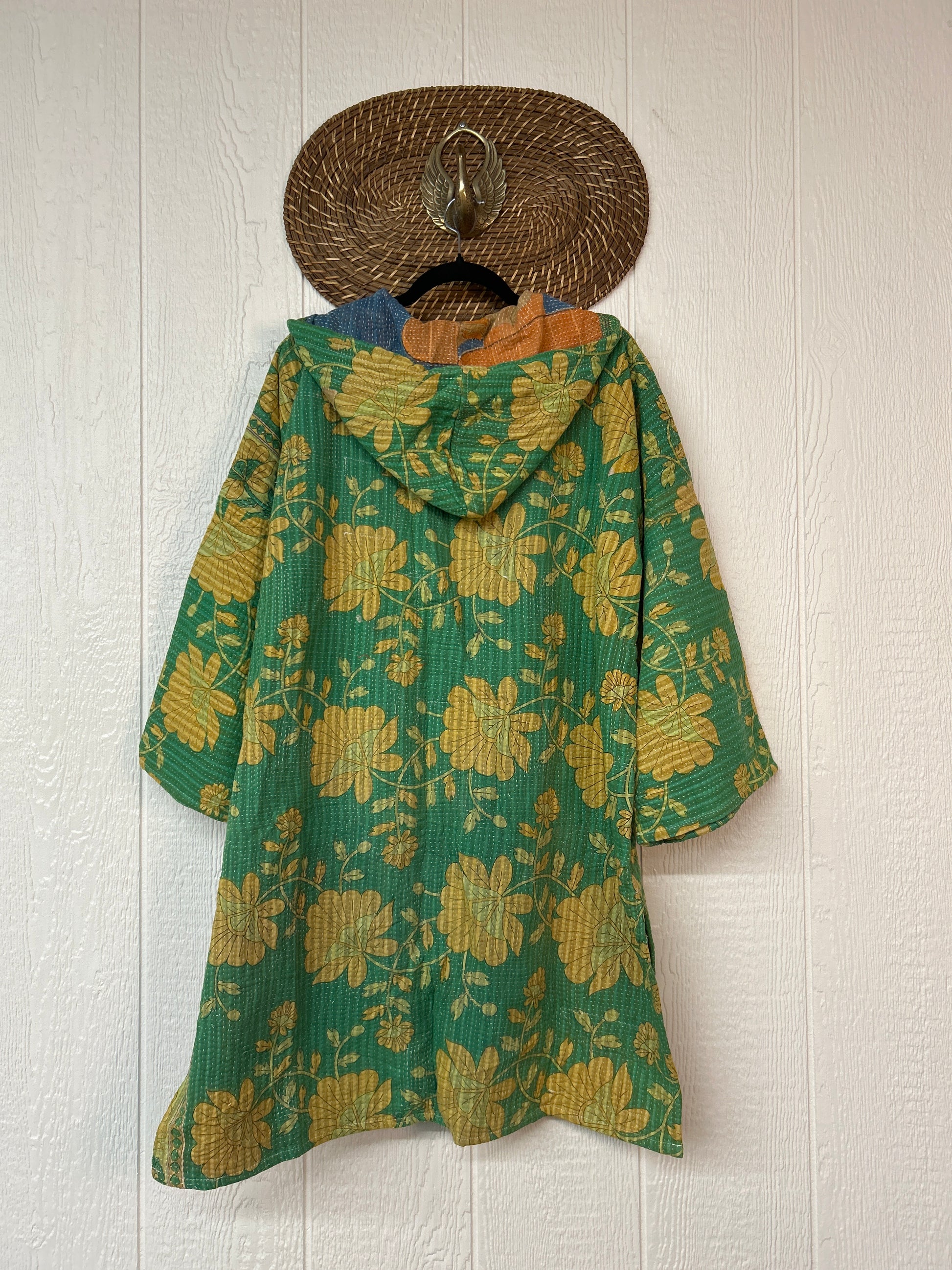 Cozy up in our Half Moon Shacket! Crafted from our ultra lux fine kantha stitched vintage cotton sari, the Half Moon Shacket features a hood, Button-down placket, deep front pockets and bell sleeves.