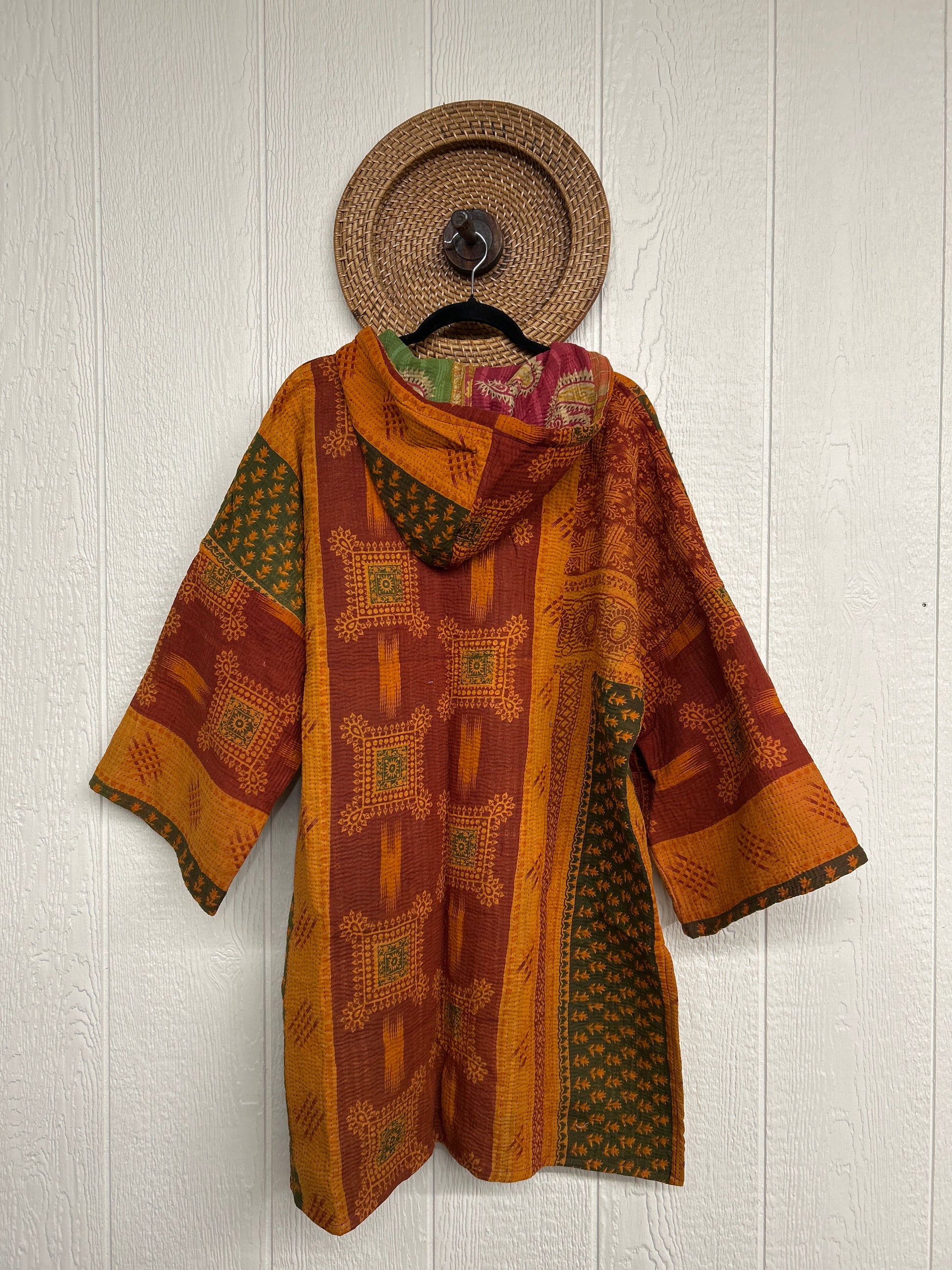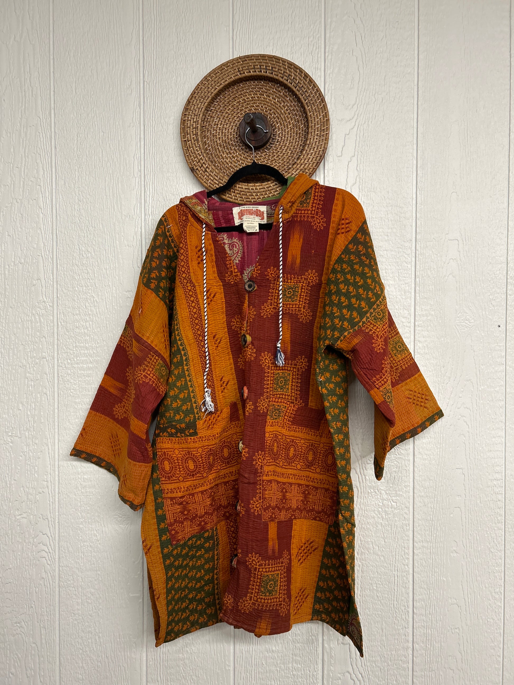 Cozy up in our Half Moon Shacket! Crafted from our ultra lux fine kantha stitched vintage cotton sari, the Half Moon Shacket features a hood, Button-down placket, deep front pockets and bell sleeves.