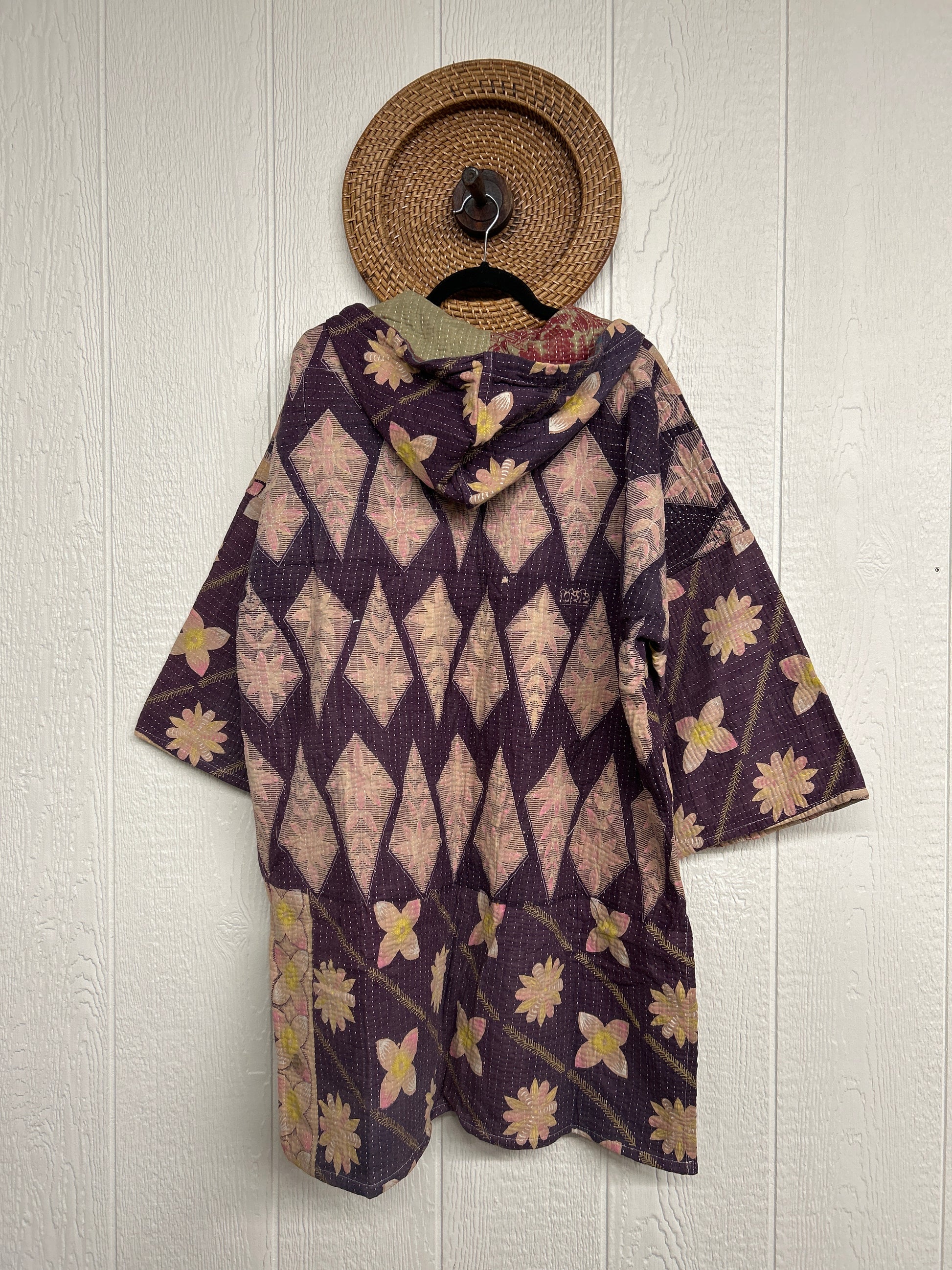 Cozy up in our Half Moon Shacket! Crafted from our ultra lux fine kantha stitched vintage cotton sari, the Half Moon Shacket features a hood, Button-down placket, deep front pockets and bell sleeves.