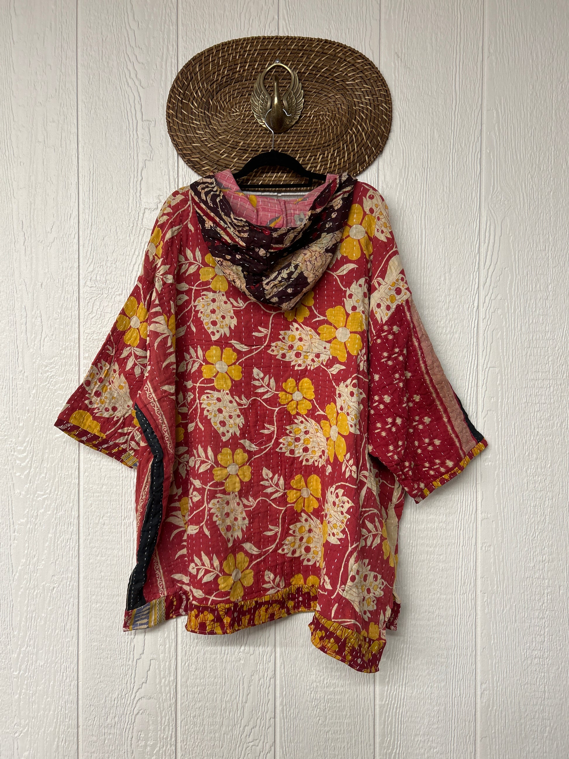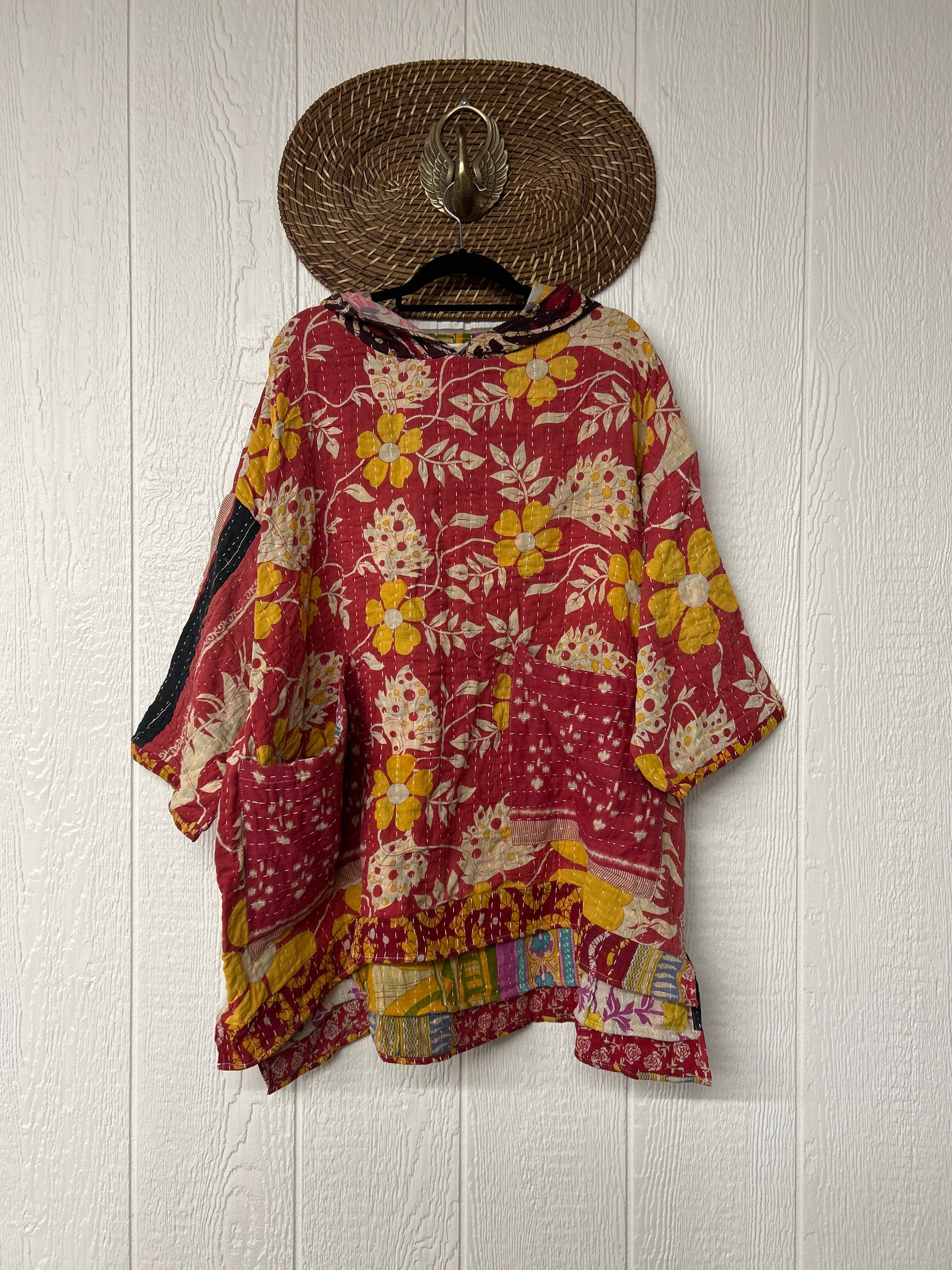 Crafted from koverlet kantha stitched cotton sari this slouchy hoodie features two exterior slouchy pockets for your treasures, a high low hem and hood.