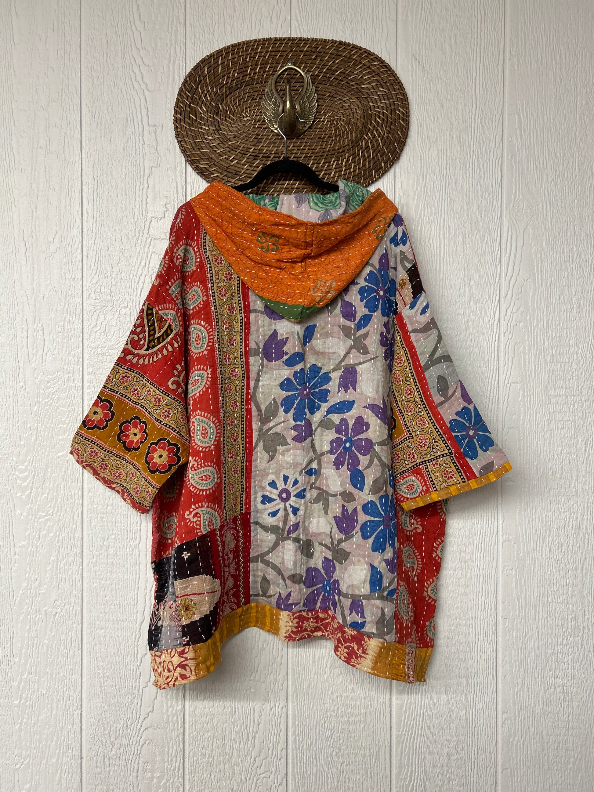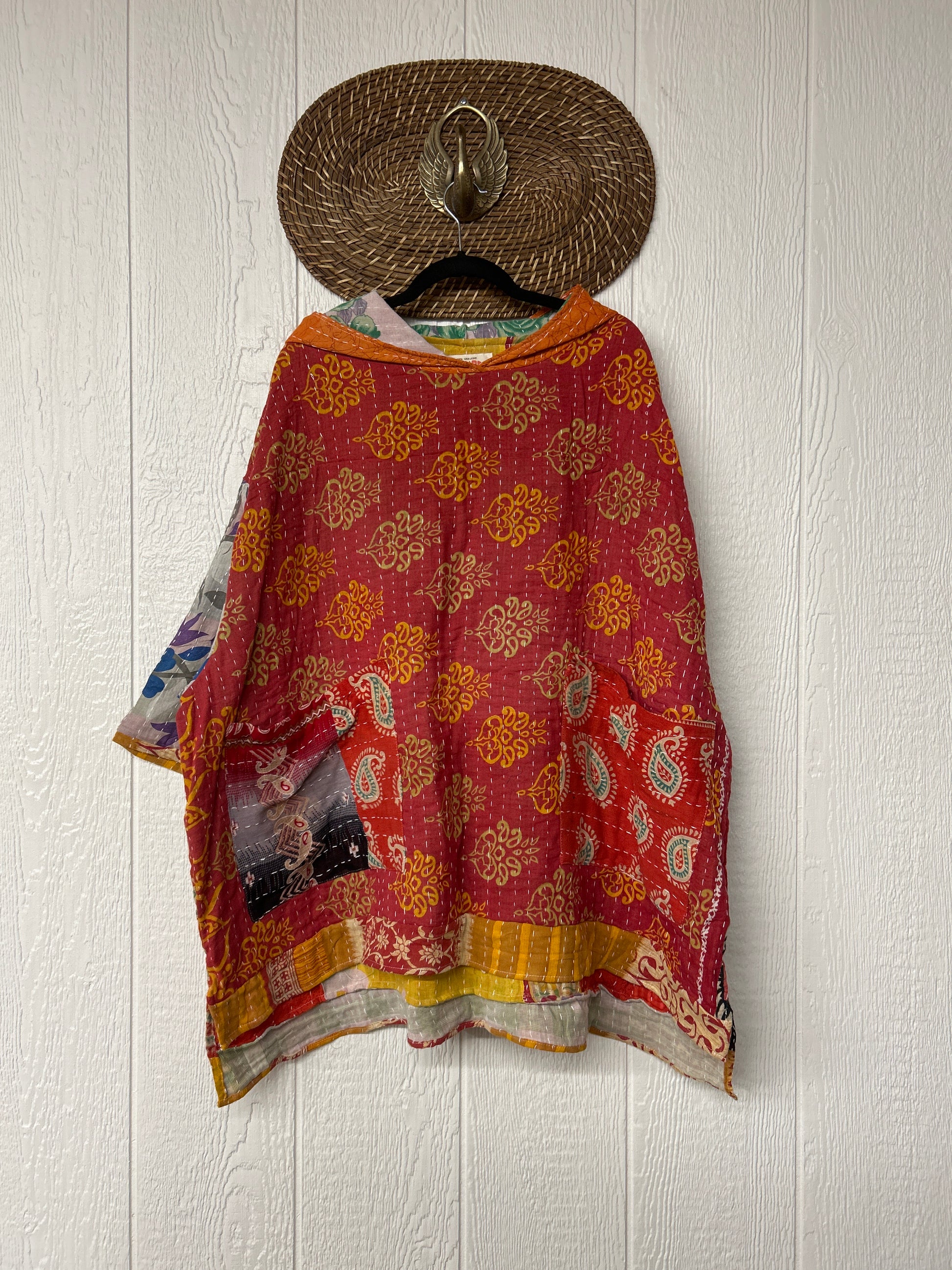 Crafted from koverlet kantha stitched cotton sari this slouchy hoodie features two exterior slouchy pockets for your treasures, a high low hem and hood.