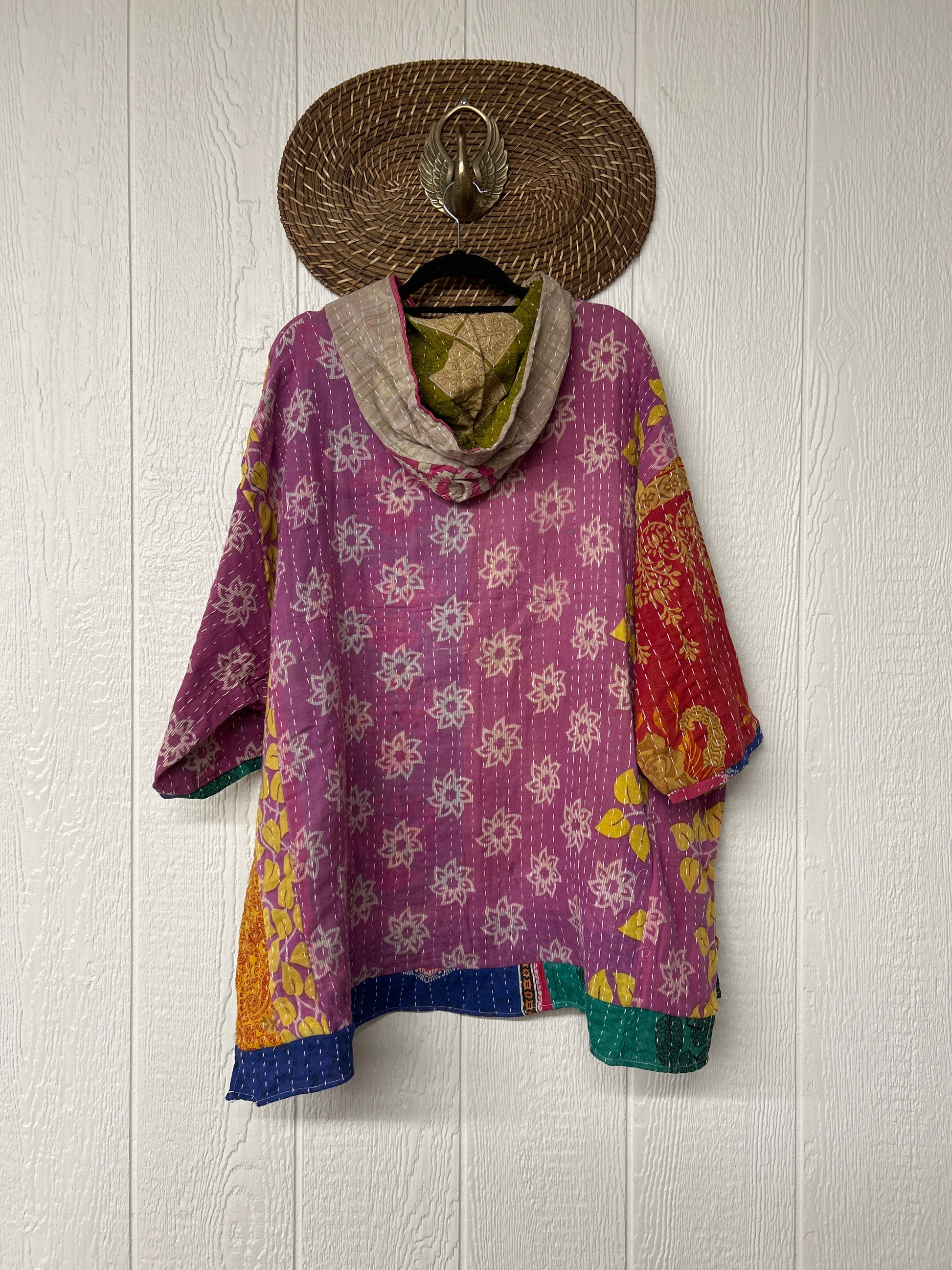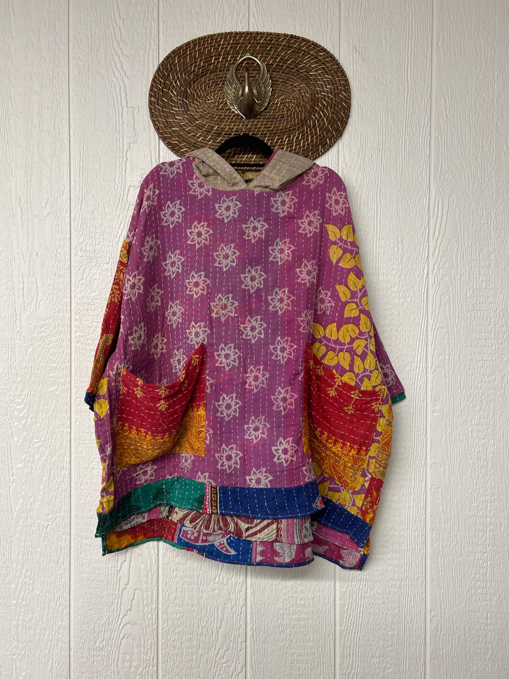 Crafted from koverlet kantha stitched cotton sari this slouchy hoodie features two exterior slouchy pockets for your treasures, a high low hem and hood.