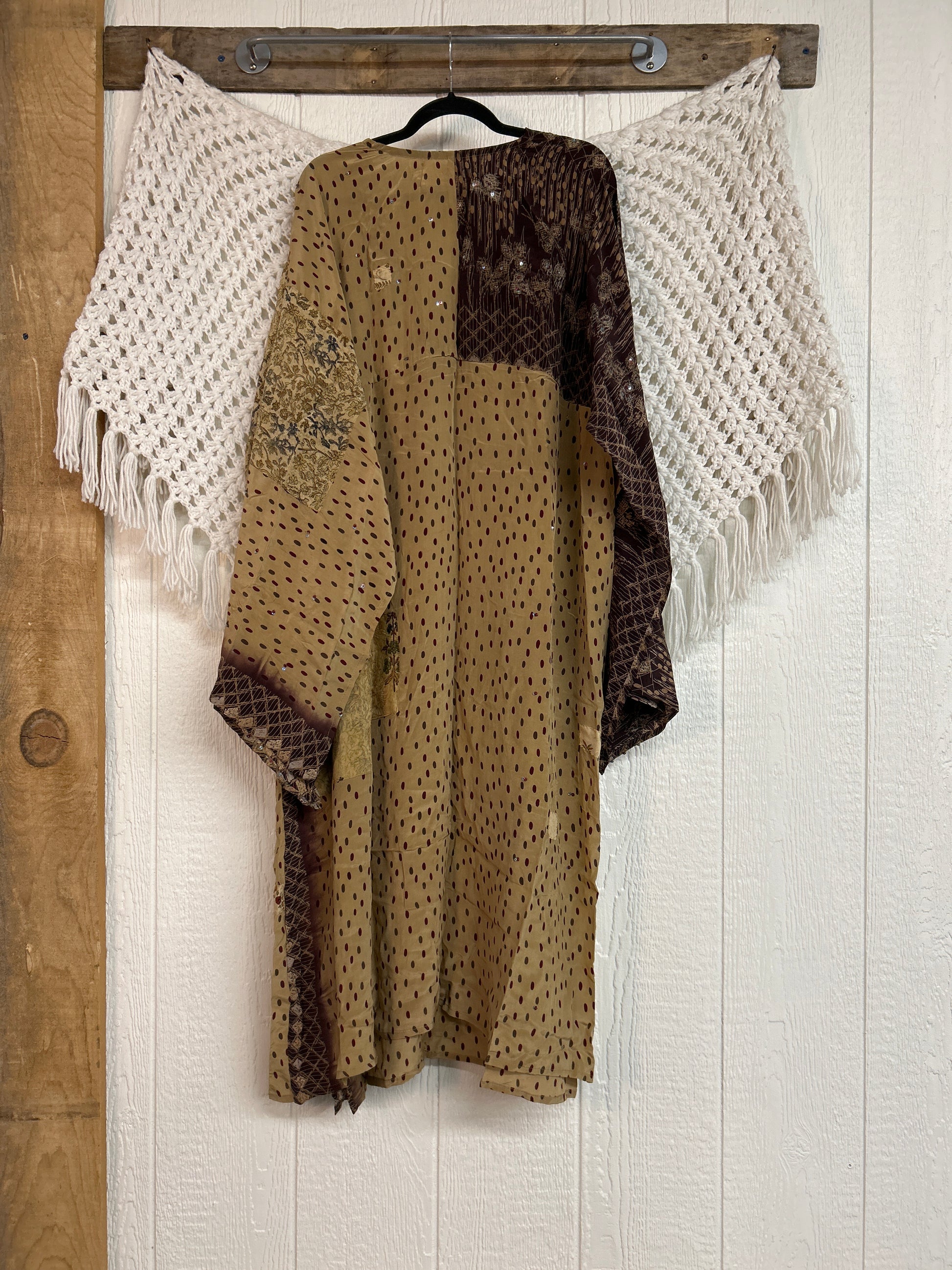 Fabrics may have small threads or holes in the layers. Color inconsistency or small stains may be present. The saris are sewn together and extend the life of each design.