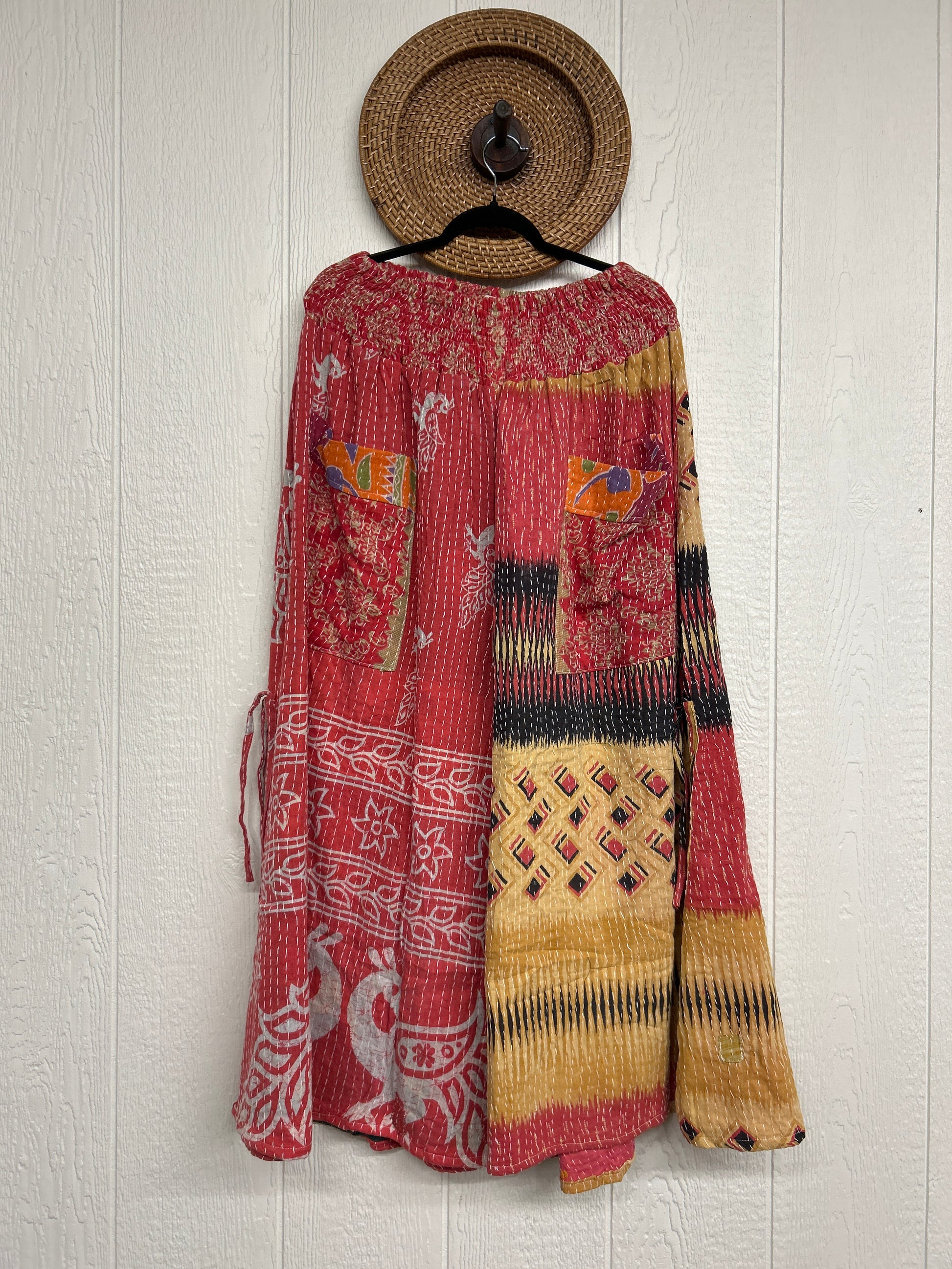 Crafted from vintage cotton kantha stitched sari these floaty pants feature super wide bell legs with ruched drawstrings on the outside for extra dimension. Front slouchy pockets are deep enough to fill with your treasures.