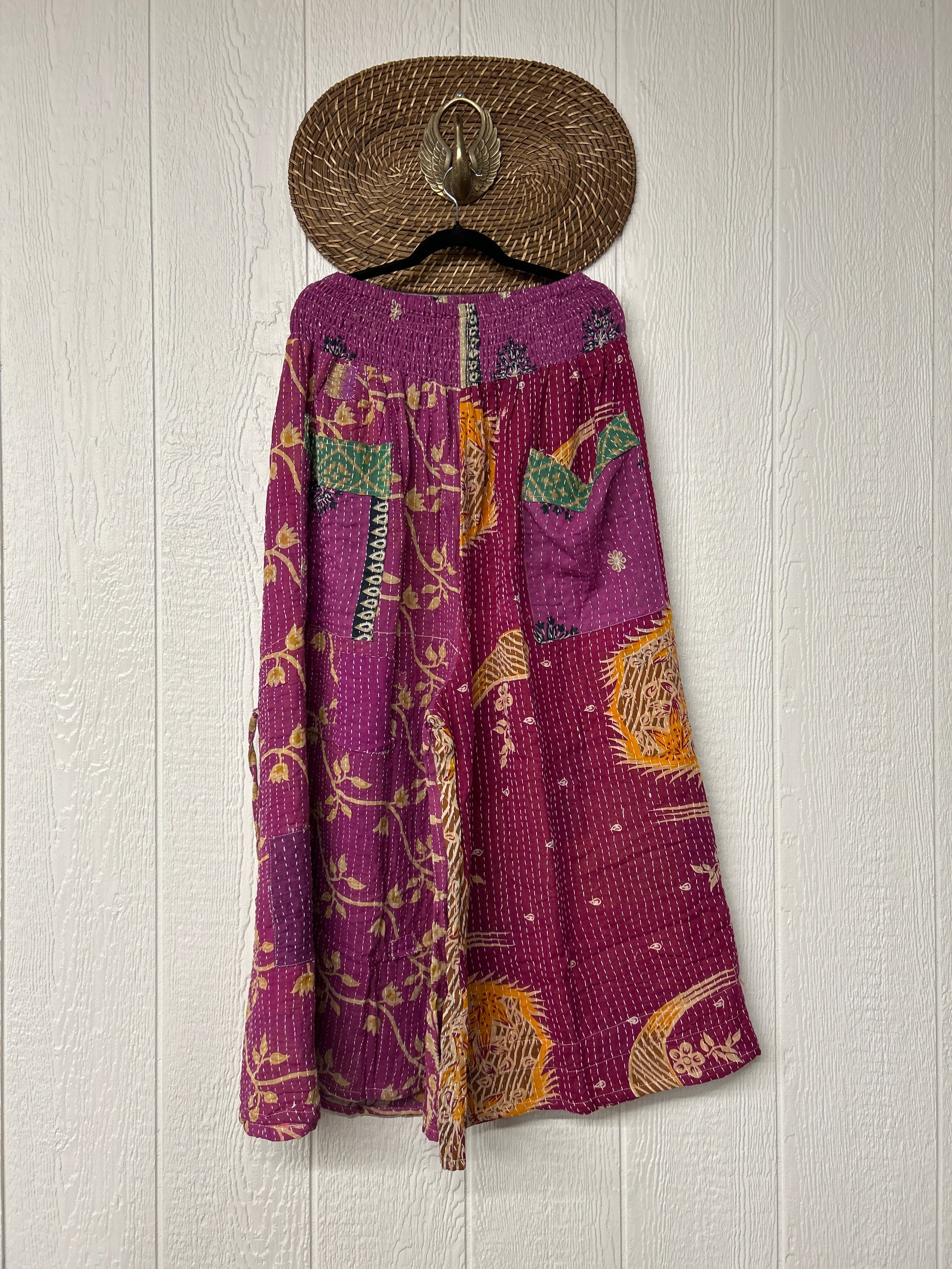 Crafted from vintage cotton kantha stitched sari these floaty pants feature super wide bell legs with ruched drawstrings on the outside for extra dimension. Front slouchy pockets are deep enough to fill with your treasures.