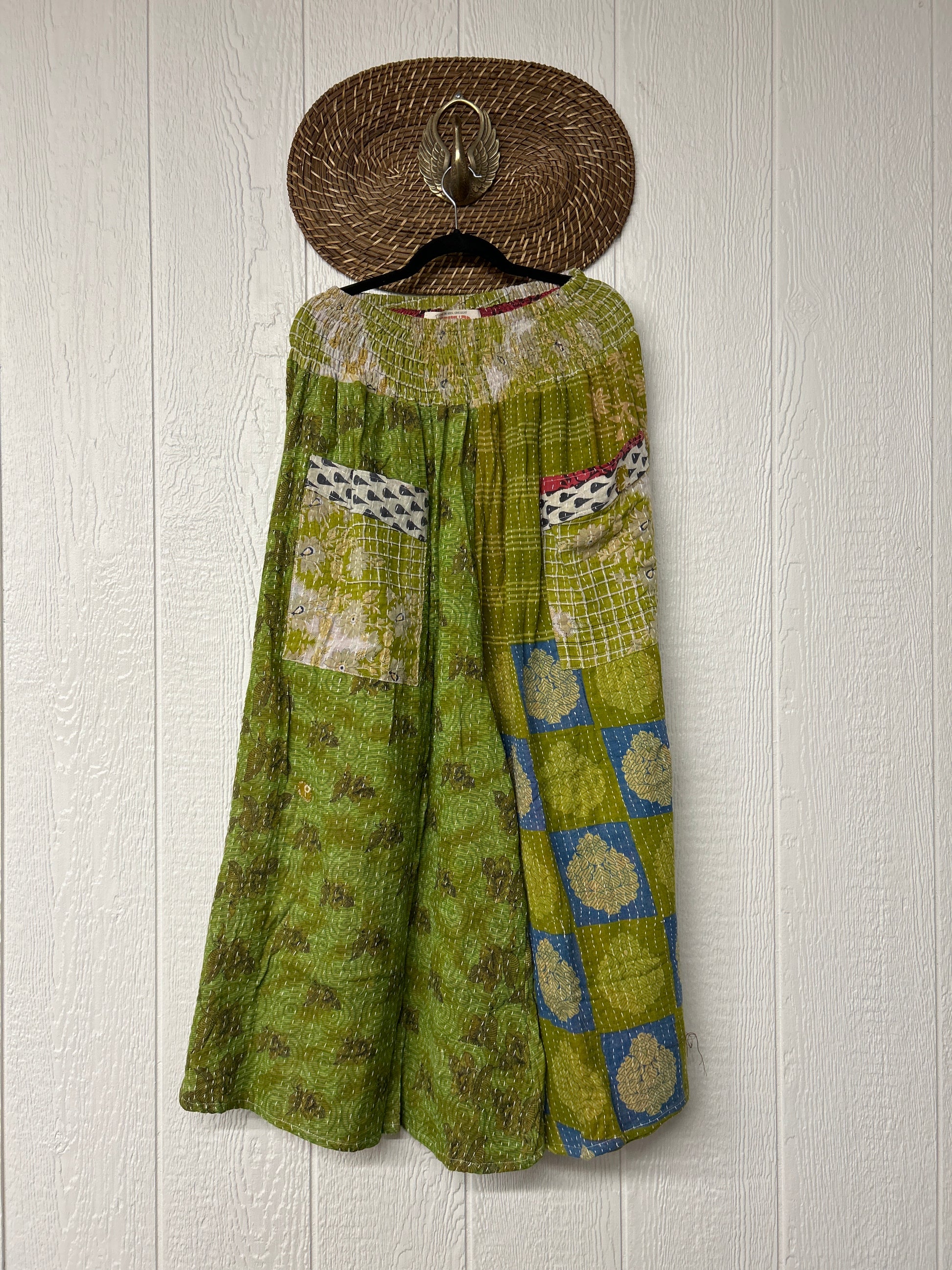 Crafted from vintage cotton kantha stitched sari these floaty pants feature super wide bell legs with ruched drawstrings on the outside for extra dimension. Front slouchy pockets are deep enough to fill with your treasures.
