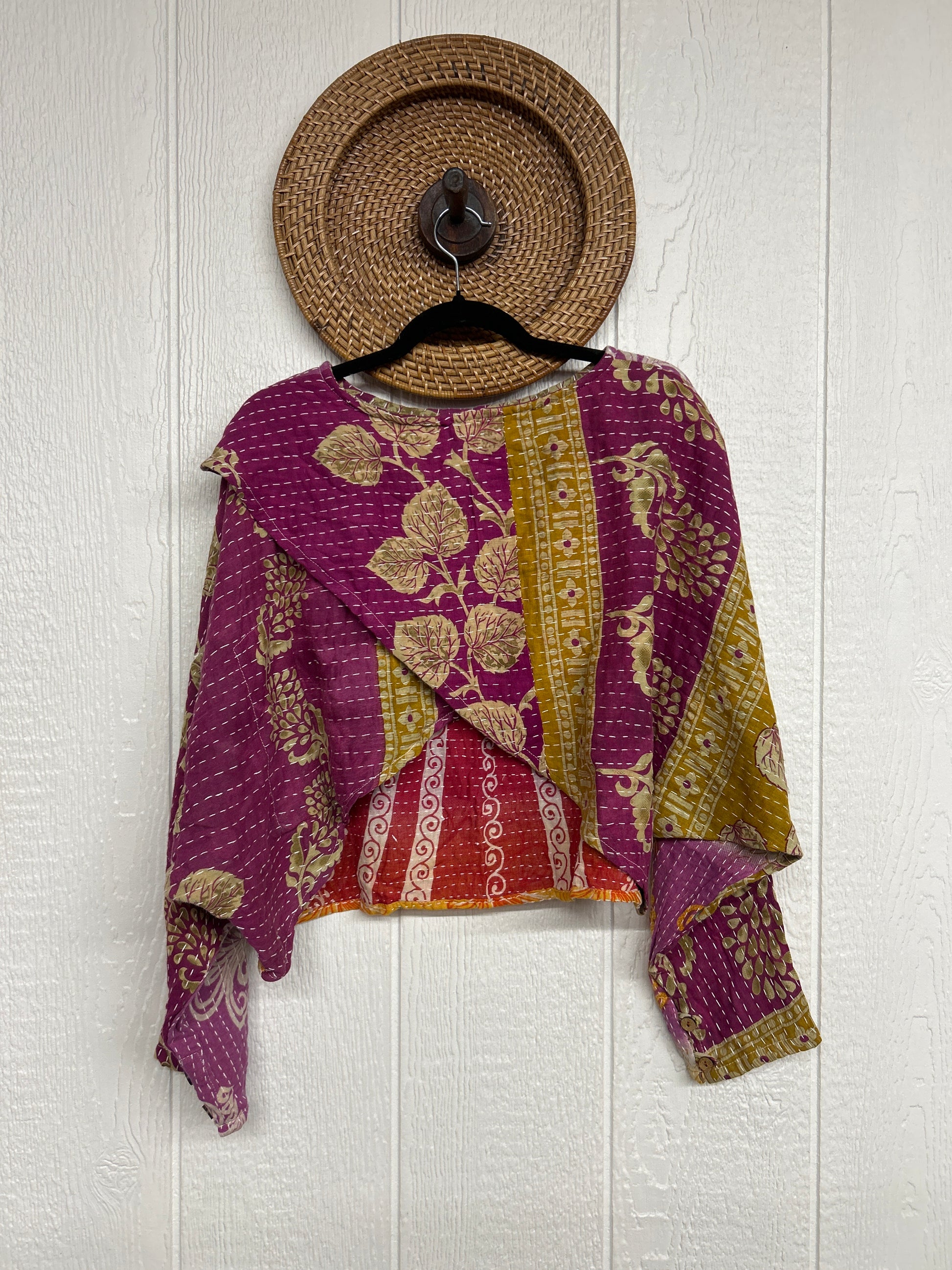 The perfect throw on piece for all of your adventures!! The In Bloom Crop Pullover is crafted from our ultra lux vintage cotton kantha stitched sari. Features a tulip front, dolman sleeves with buttons on the cuff. This layer can be worn on all 4 sides!!!