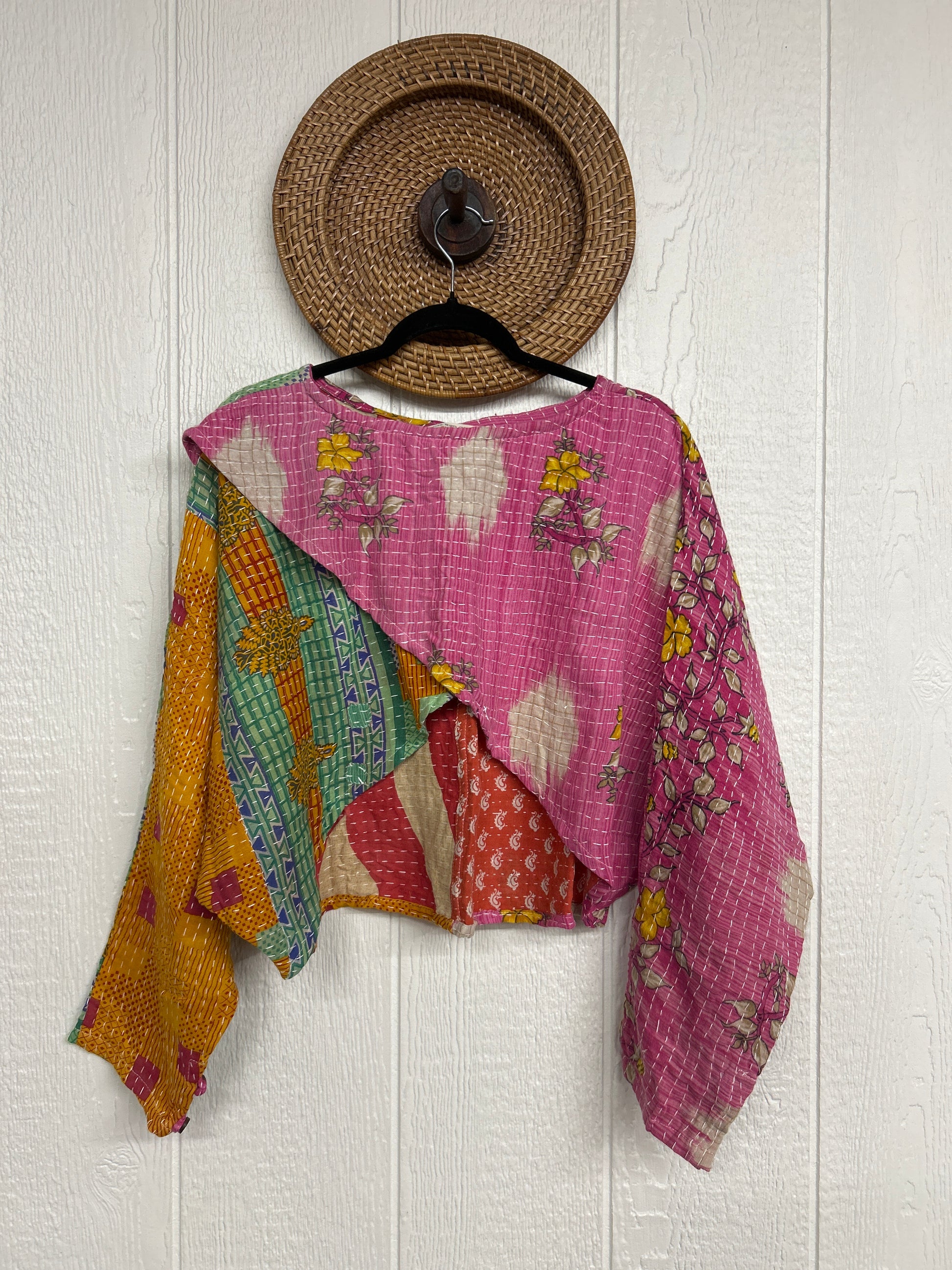 The perfect throw on piece for all of your adventures!! The In Bloom Crop Pullover is crafted from our ultra lux vintage cotton kantha stitched sari. Features a tulip front, dolman sleeves with buttons on the cuff. This layer can be worn on all 4 sides!!!