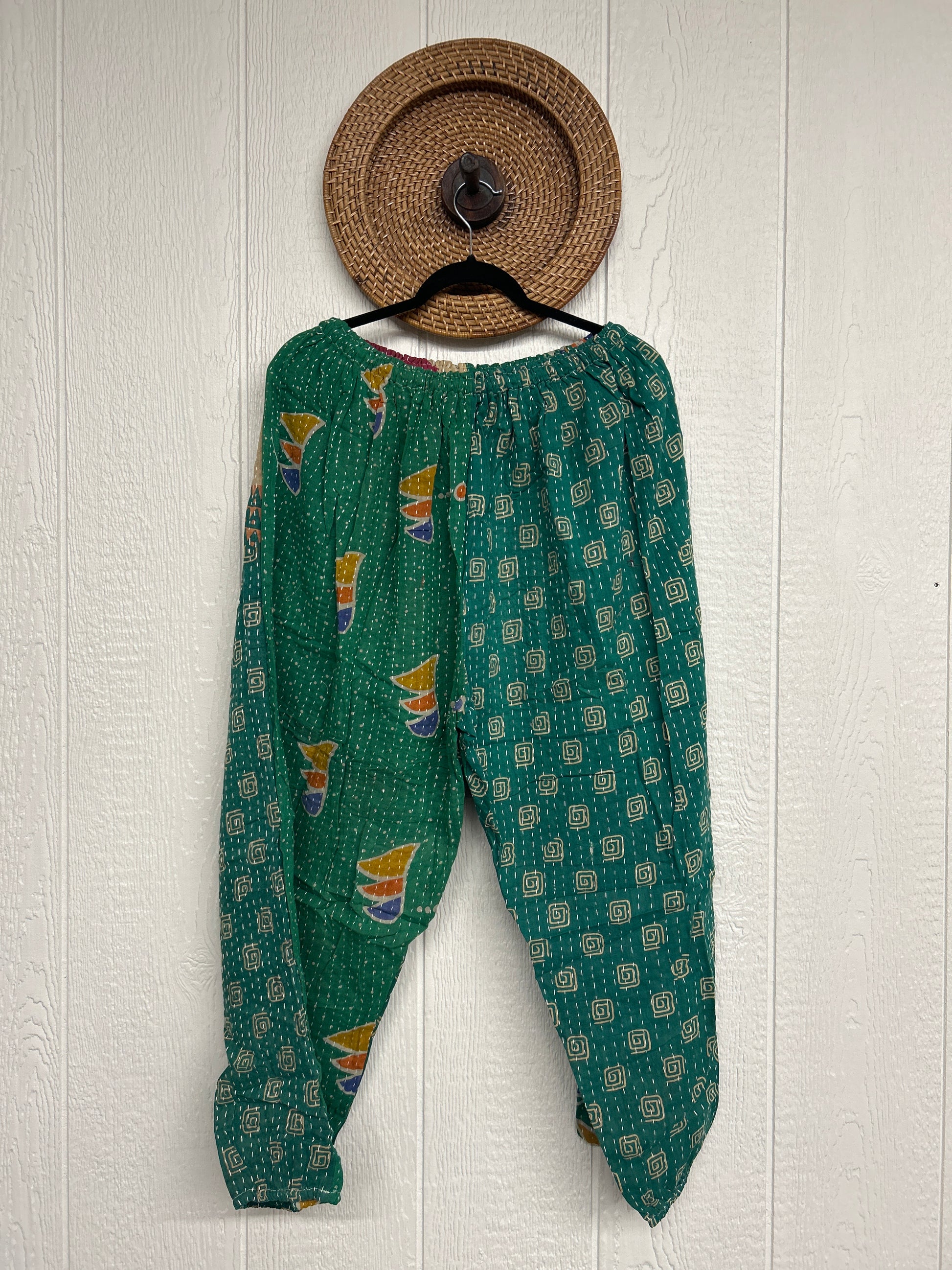 Crafted from luxe vintage kantha stitched cotton sari these chic kantha joggers feature two slouchy big exterior pockets and a thin elastic "jogger" opening at the leg . The waistband is magic and elastic featuring a drawstring for ultimate versatility.
