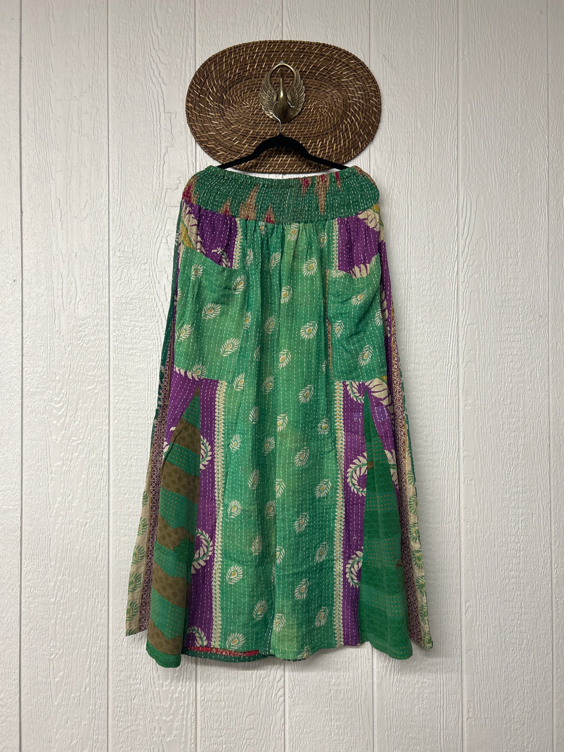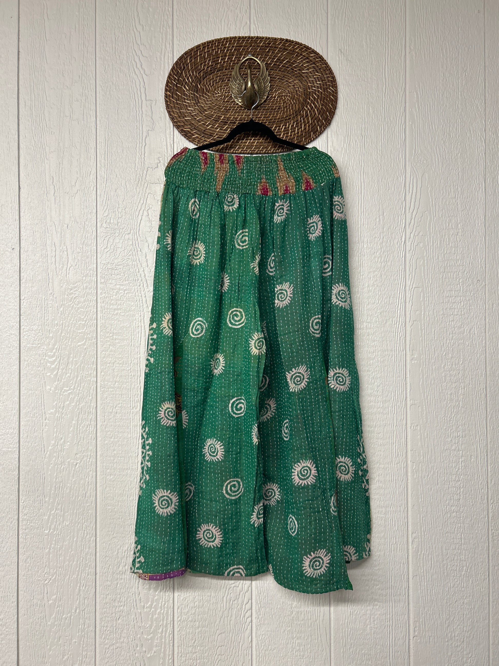 Crafted from our ultra lux vintage cotton kantha stitched sari these floaty pants feature super wide legs with front and back vintage crepe inserts that make your pants dance when you walk. Front slouchy pockets are deep enough to fill with your treasures.