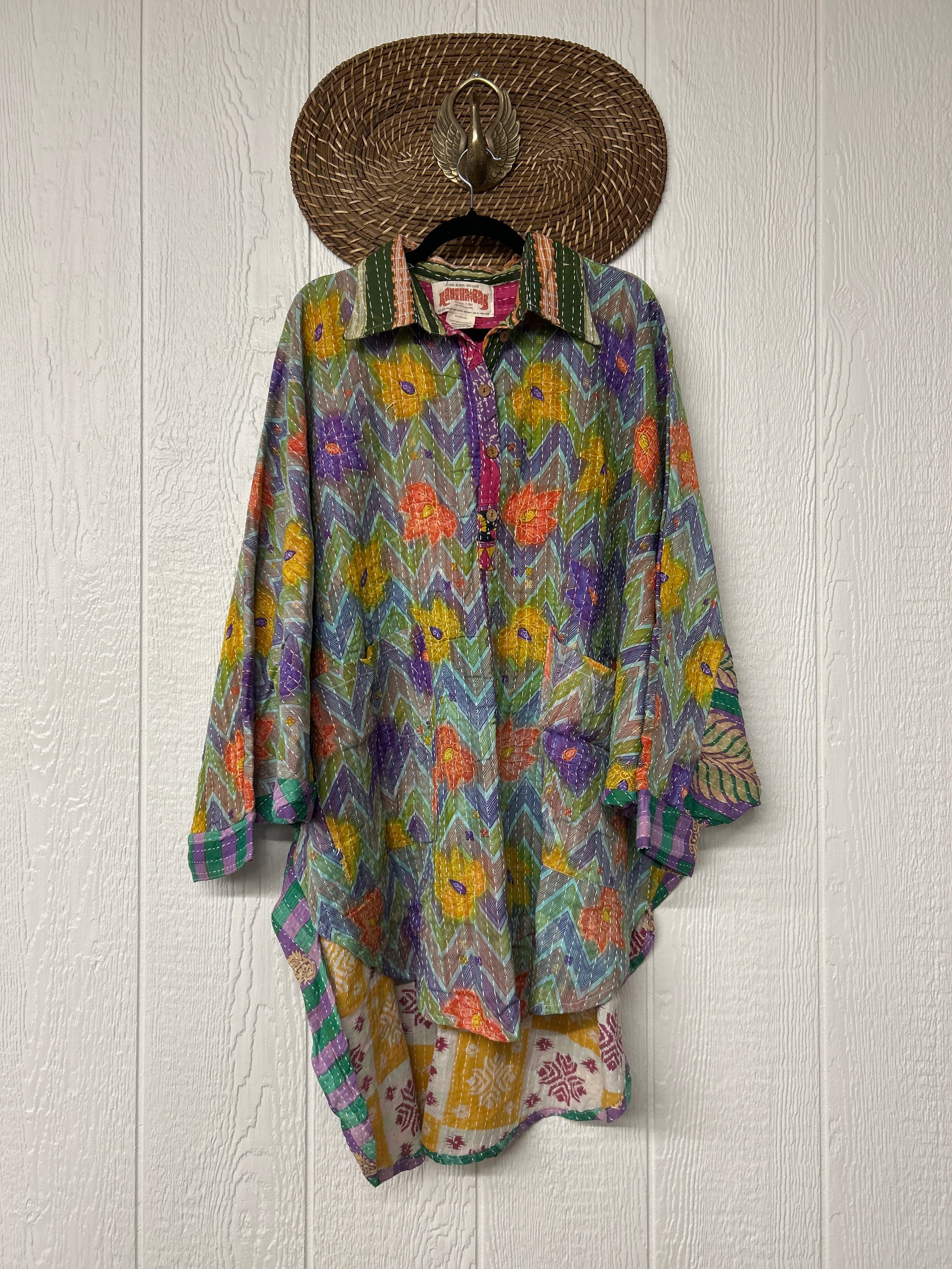 Made from our hand kantha stitched vintage cotton sari, this piece of wearable art features a henley neckline with functional buttons, slouchy outer pockets, billowy sleeves and a rounded hemline. The perfect top to compliment your favorite kantha pants or bell bottoms.