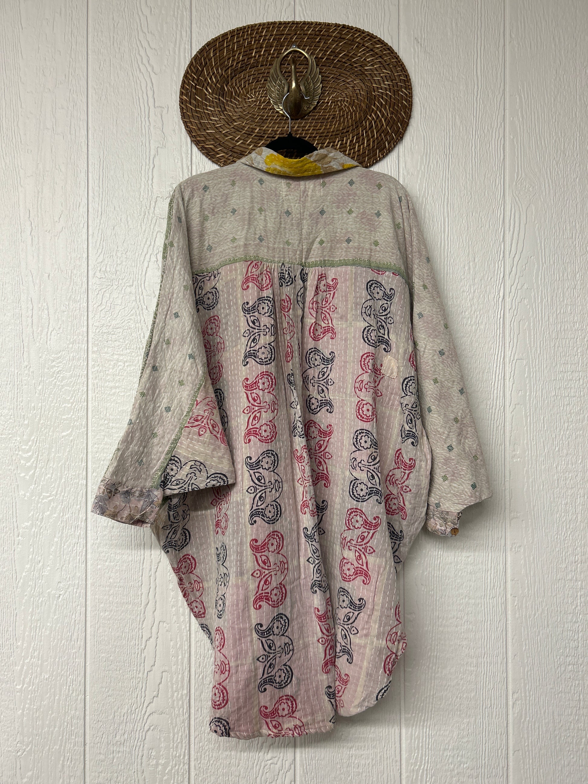 Made from our hand kantha stitched vintage cotton sari, this piece of wearable art features a henley neckline with functional buttons, slouchy outer pockets, billowy sleeves and a rounded hemline. The perfect top to compliment your favorite kantha pants or bell bottoms.