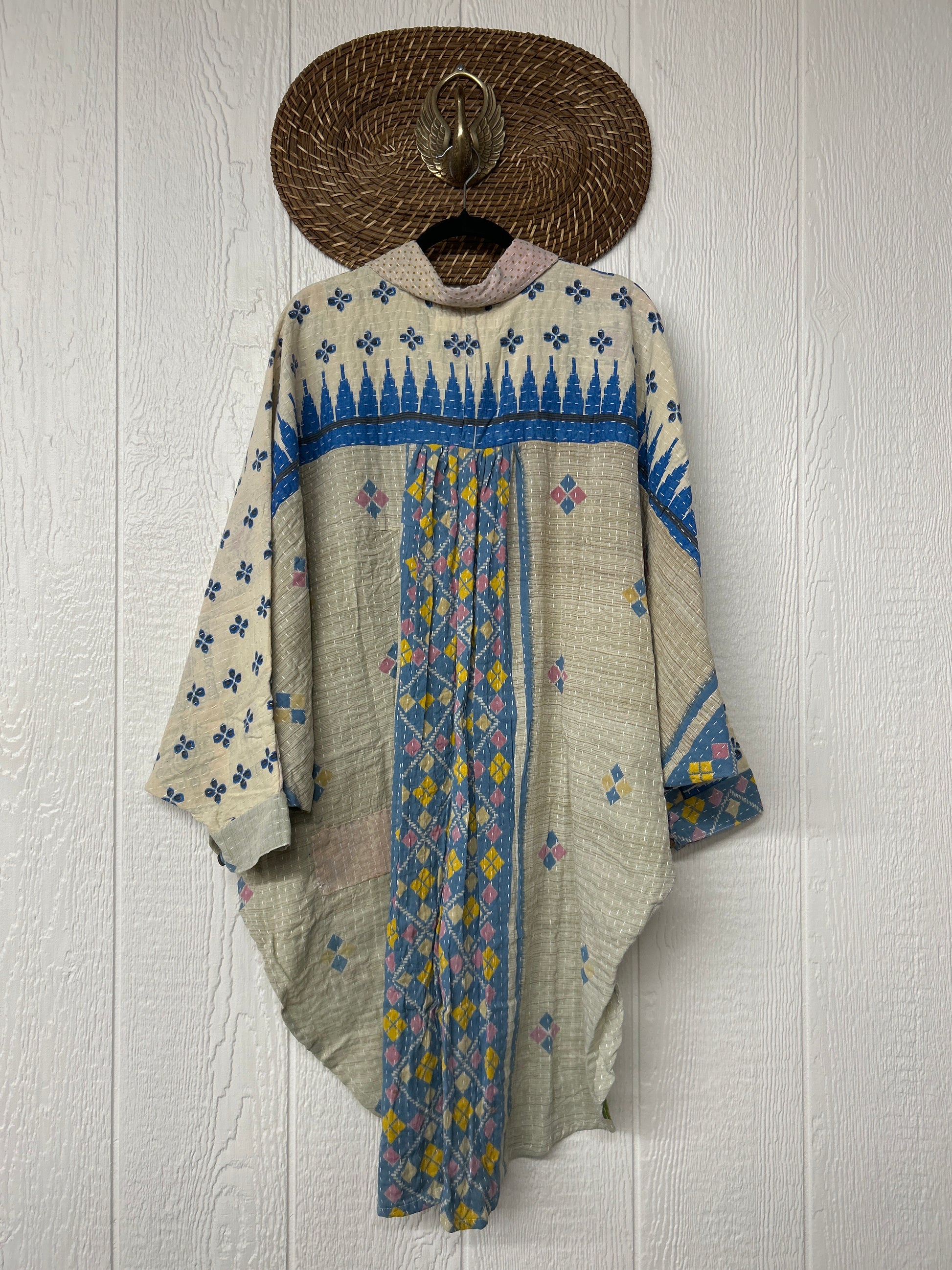 Made from our hand kantha stitched vintage cotton sari, this piece of wearable art features a henley neckline with functional buttons, slouchy outer pockets, billowy sleeves and a rounded hemline. The perfect top to compliment your favorite kantha pants or bell bottoms.