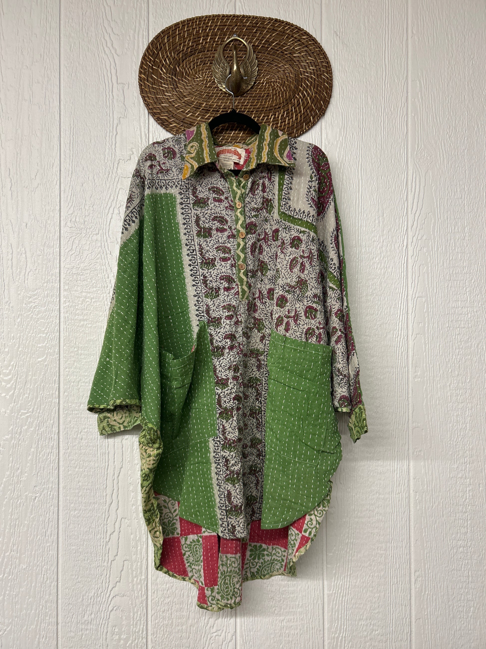 Made from our hand kantha stitched vintage cotton sari, this piece of wearable art features a henley neckline with functional buttons, slouchy outer pockets, billowy sleeves and a rounded hemline. The perfect top to compliment your favorite kantha pants or bell bottoms.
