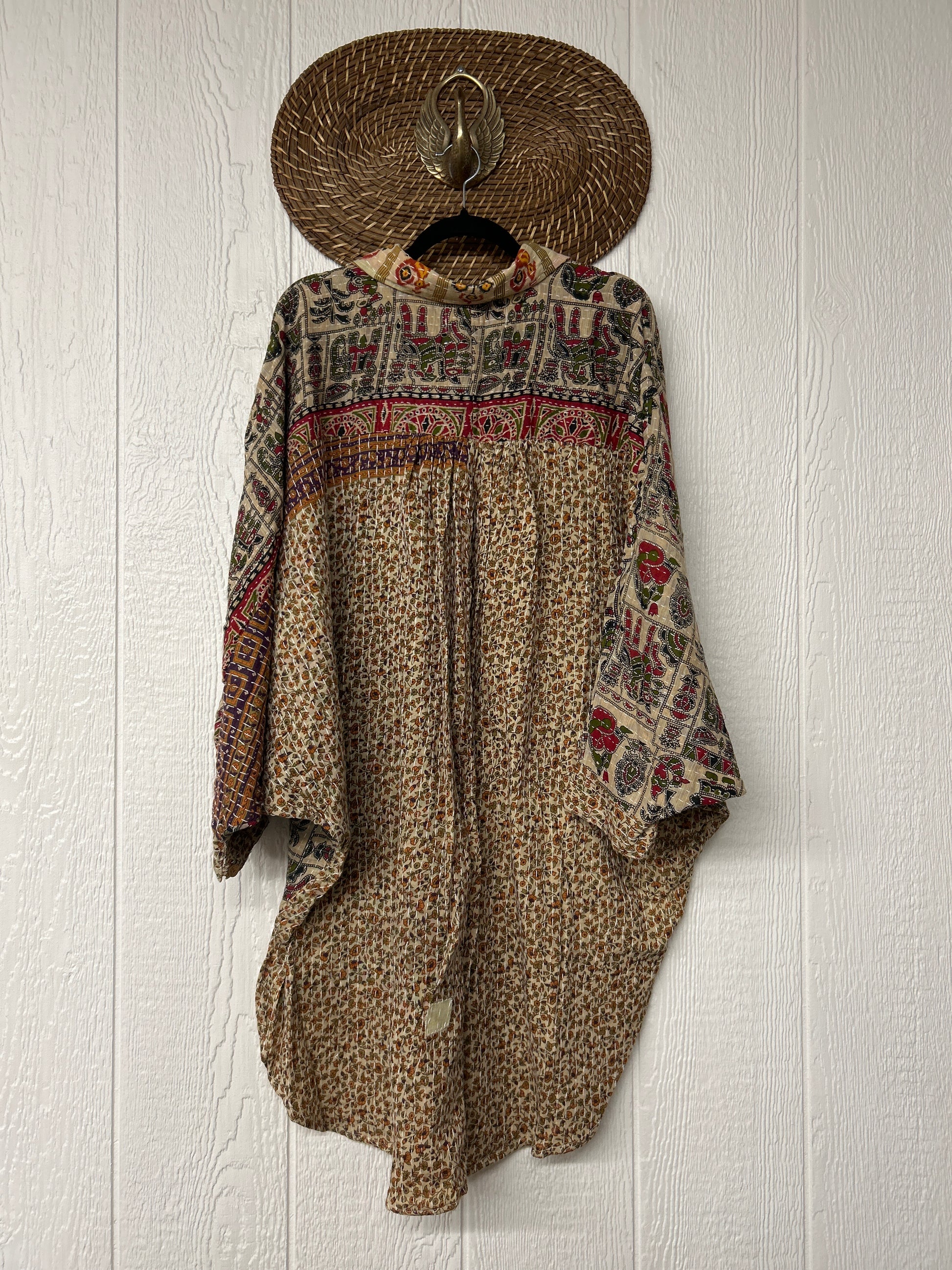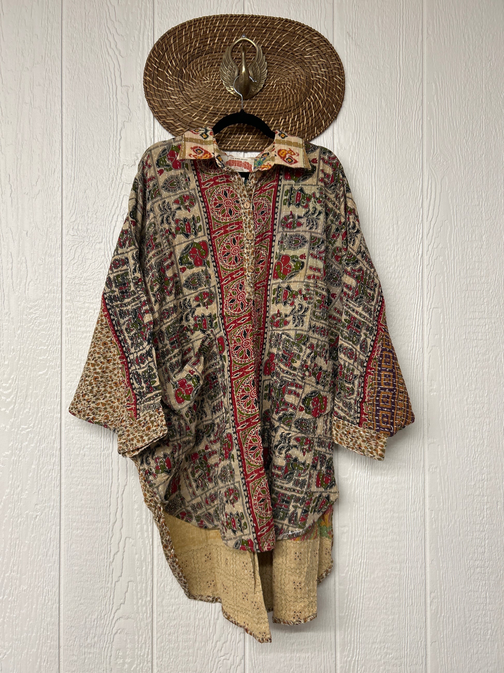 Made from our hand kantha stitched vintage cotton sari, this piece of wearable art features a henley neckline with functional buttons, slouchy outer pockets, billowy sleeves and a rounded hemline. The perfect top to compliment your favorite kantha pants or bell bottoms.