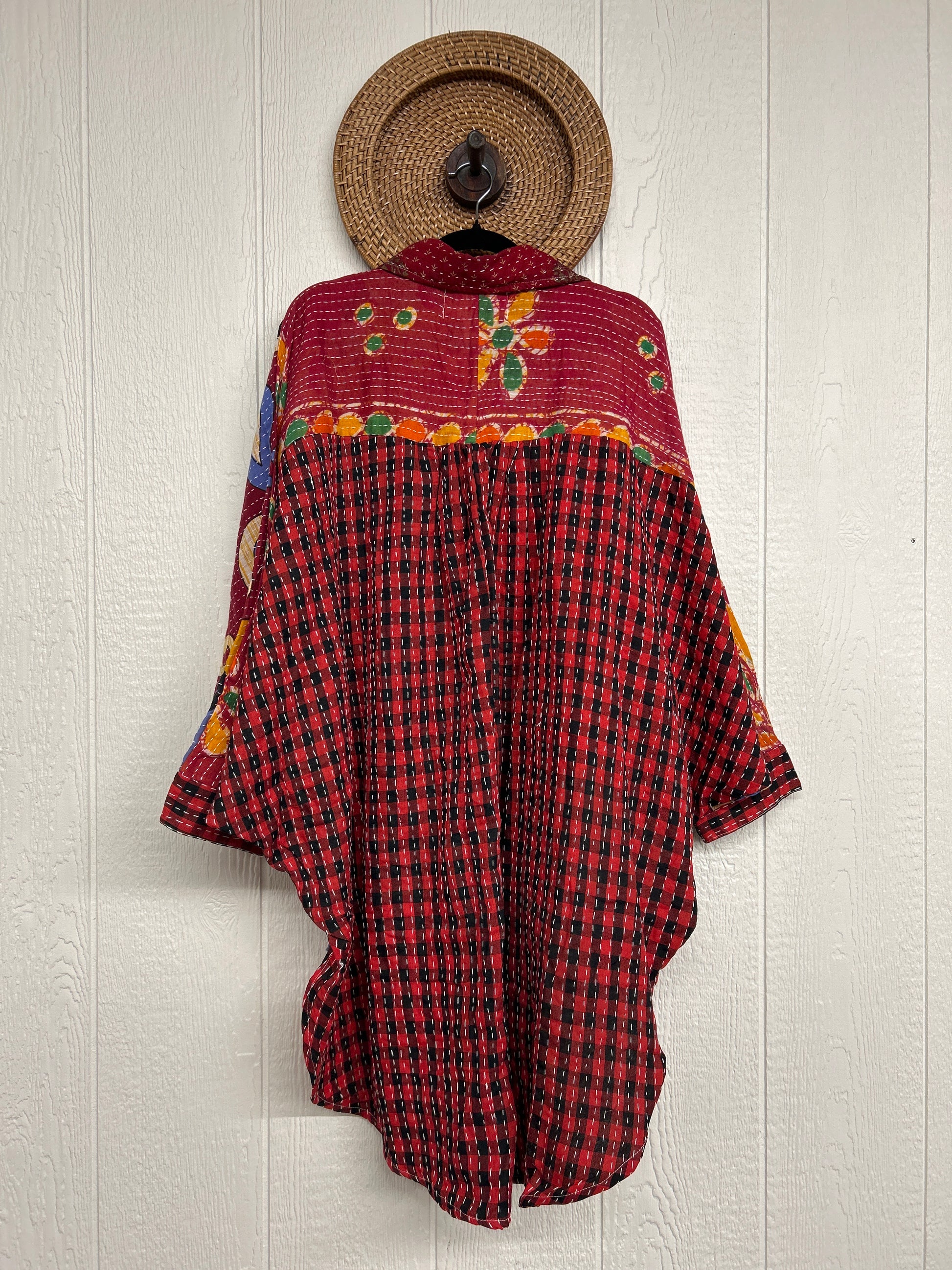 Made from our hand kantha stitched vintage cotton sari, this piece of wearable art features a henley neckline with functional buttons, slouchy outer pockets, billowy sleeves and a rounded hemline. The perfect top to compliment your favorite kantha pants or bell bottoms.