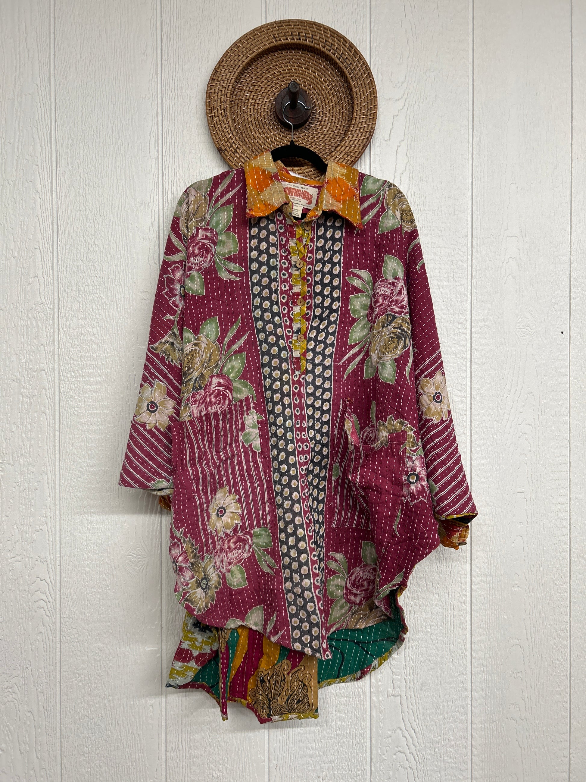 Made from our hand kantha stitched vintage cotton sari, this piece of wearable art features a henley neckline with functional buttons, slouchy outer pockets, billowy sleeves and a rounded hemline. The perfect top to compliment your favorite kantha pants or bell bottoms.