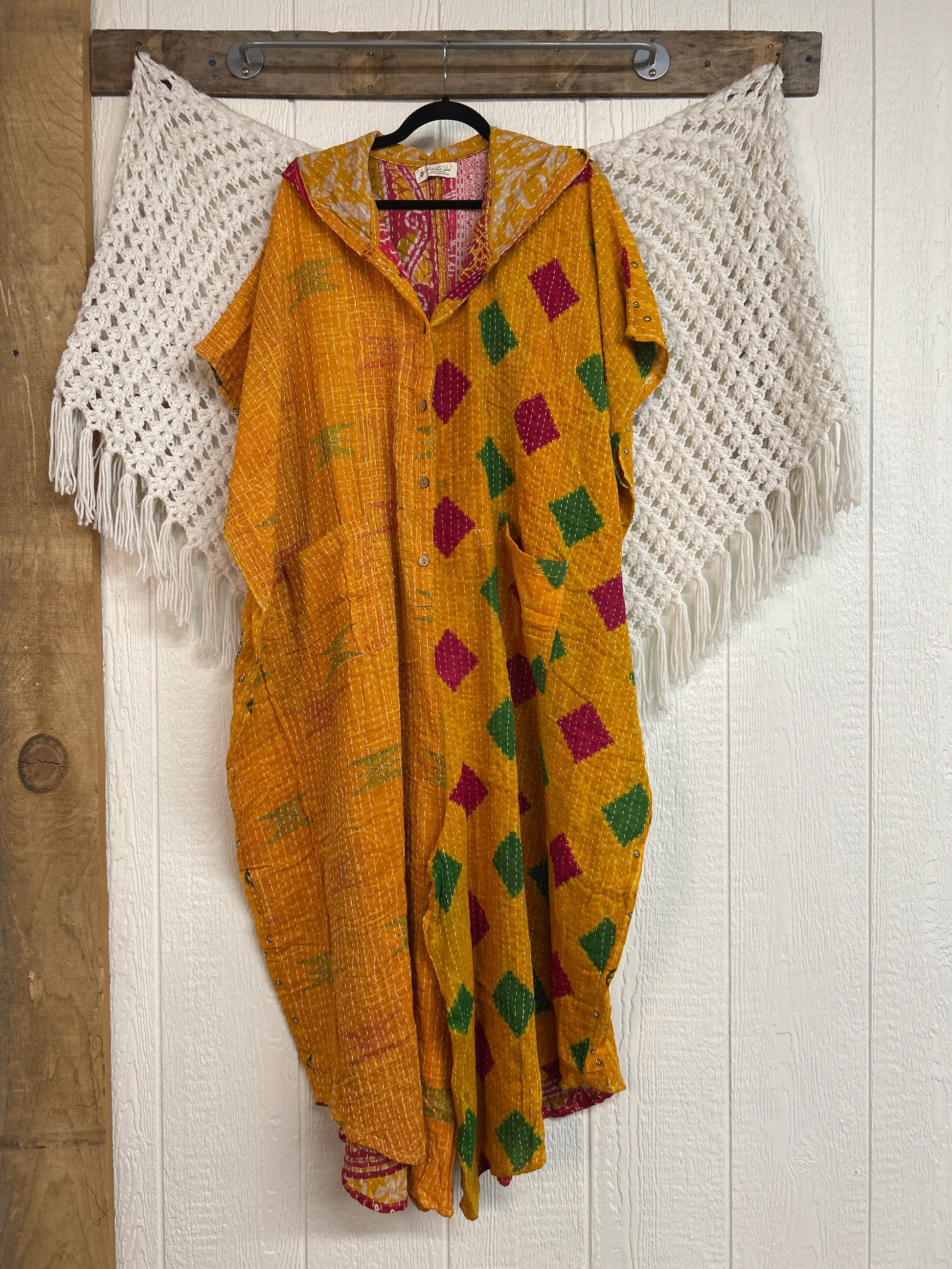 Made from our hand Kantha stitched cotton sari, this one piece wonder features a hood, front button-down closure, pockets, and super flowy pant legs..