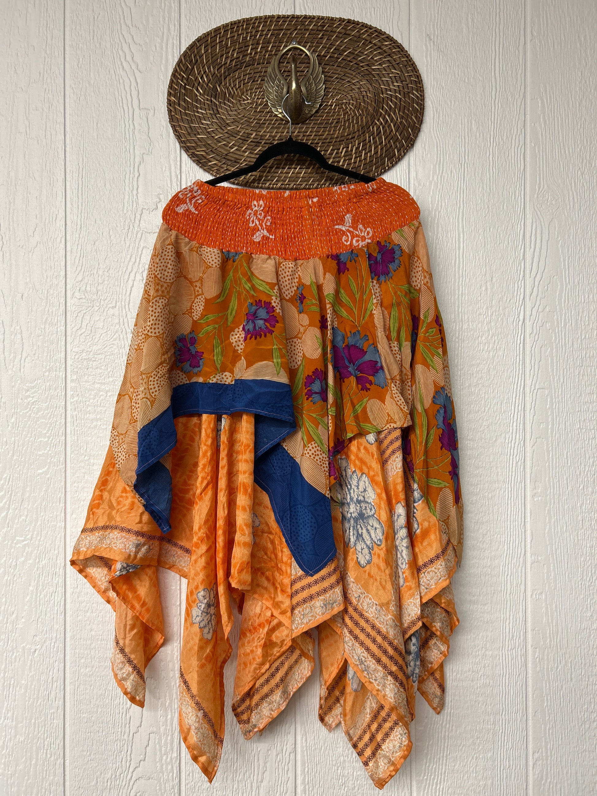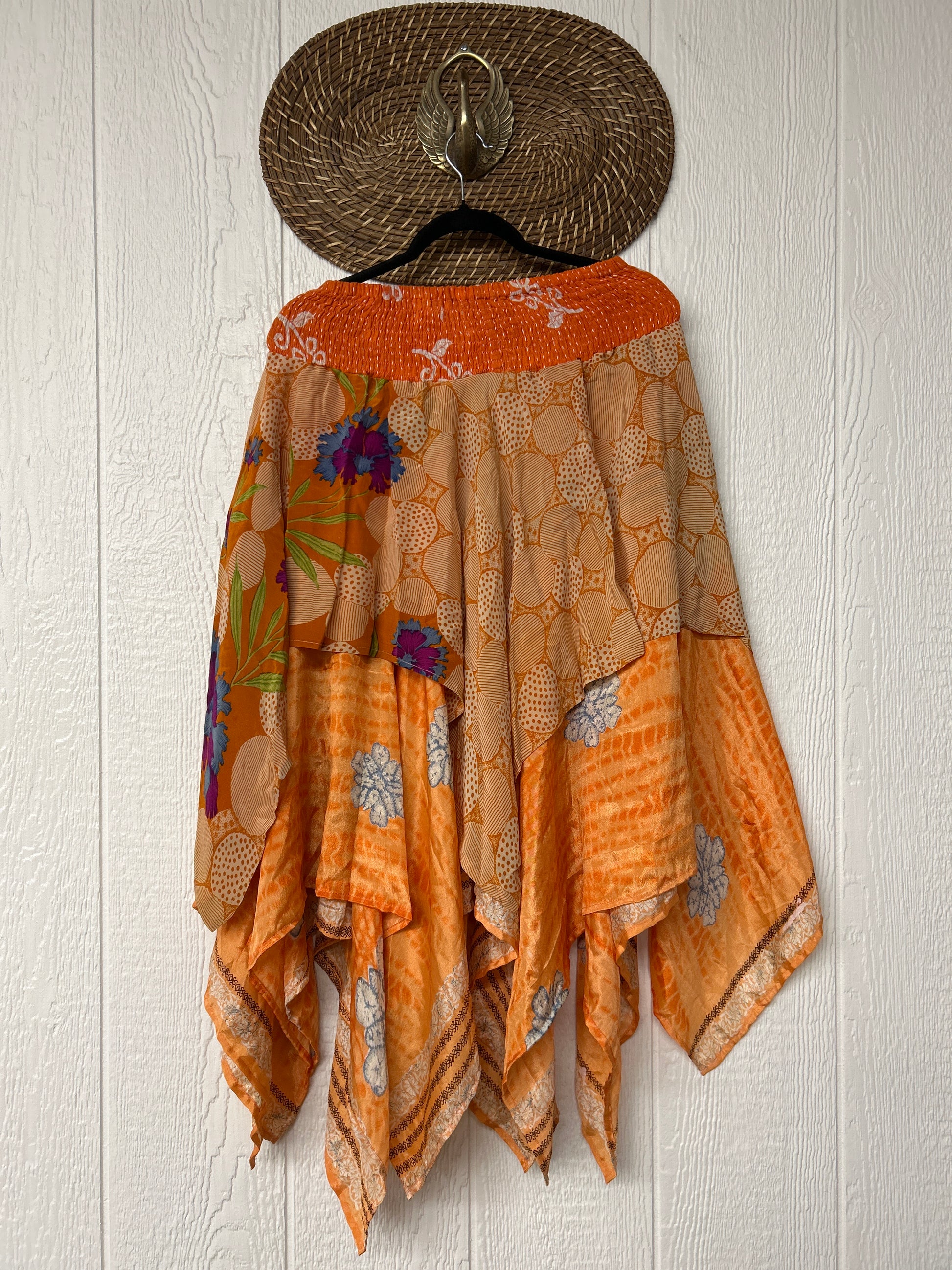 crafted from our ultra lux vintage crepe and ragulla sari. Features a rock star asymmetrical hem and stretchy pareo kantha waistband. This versatile piece can be pulled up to be worn as a tunic!