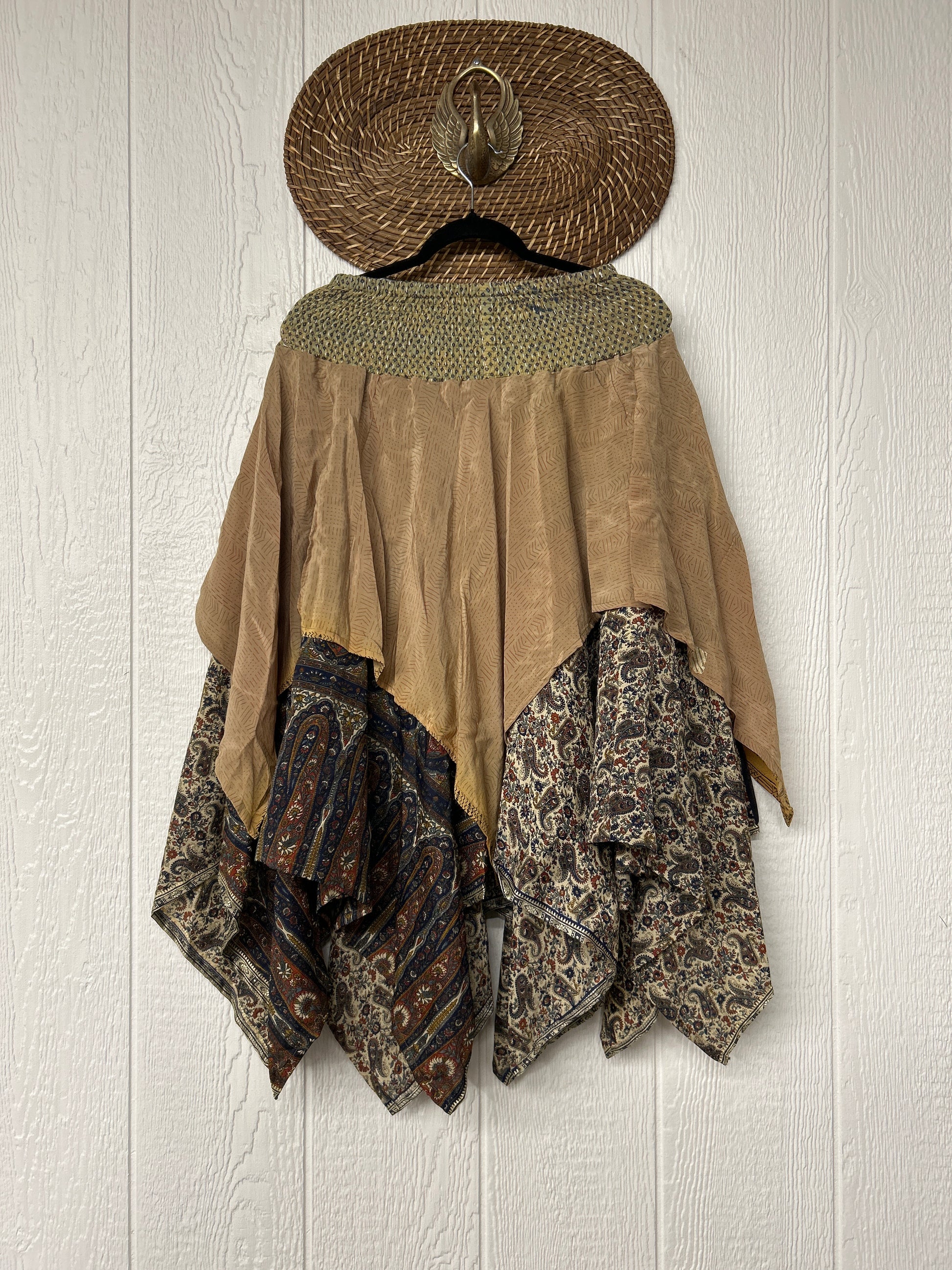 crafted from our ultra lux vintage crepe and ragulla sari. Features a rock star asymmetrical hem and stretchy pareo kantha waistband. This versatile piece can be pulled up to be worn as a tunic!