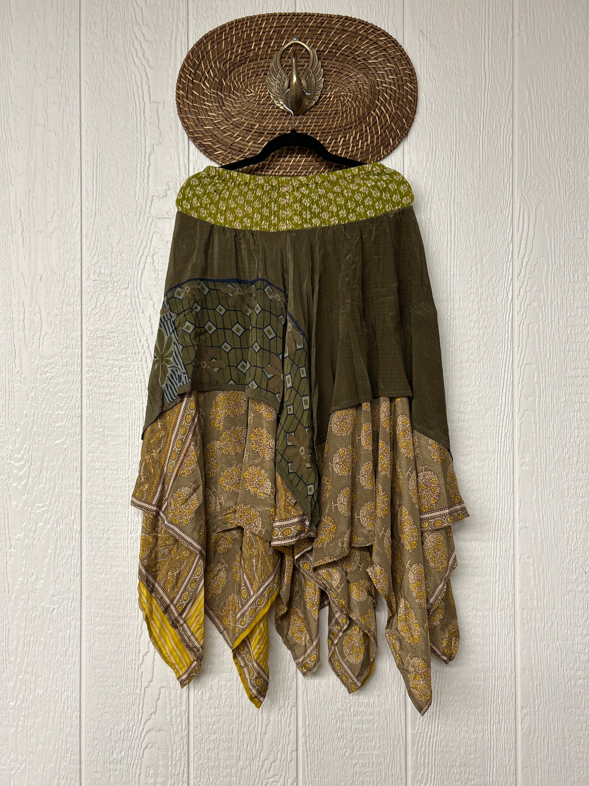 crafted from our ultra lux vintage crepe and ragulla sari. Features a rock star asymmetrical hem and stretchy pareo kantha waistband. This versatile piece can be pulled up to be worn as a tunic!