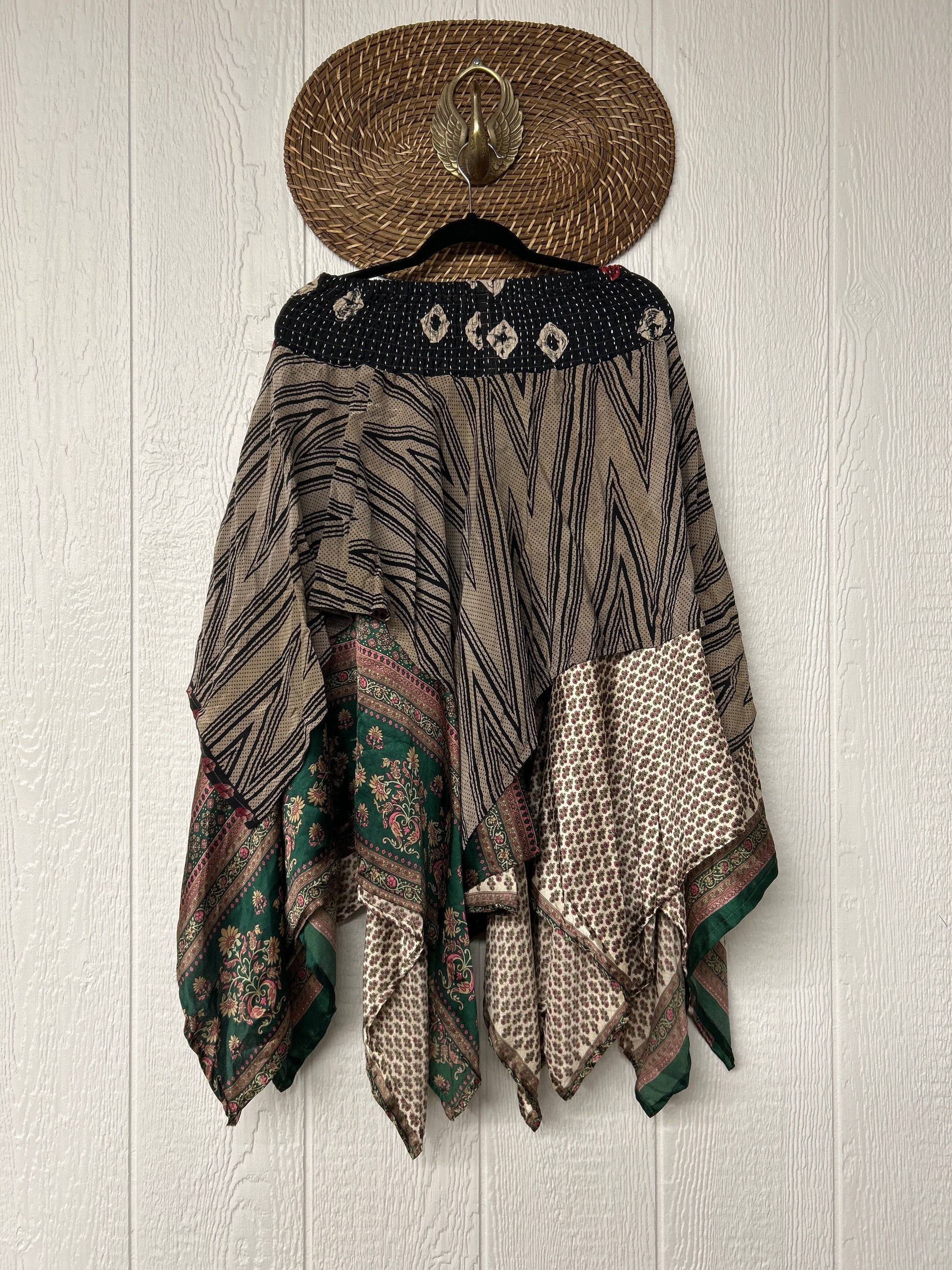 crafted from our ultra lux vintage crepe and ragulla sari. Features a rock star asymmetrical hem and stretchy pareo kantha waistband. This versatile piece can be pulled up to be worn as a tunic!