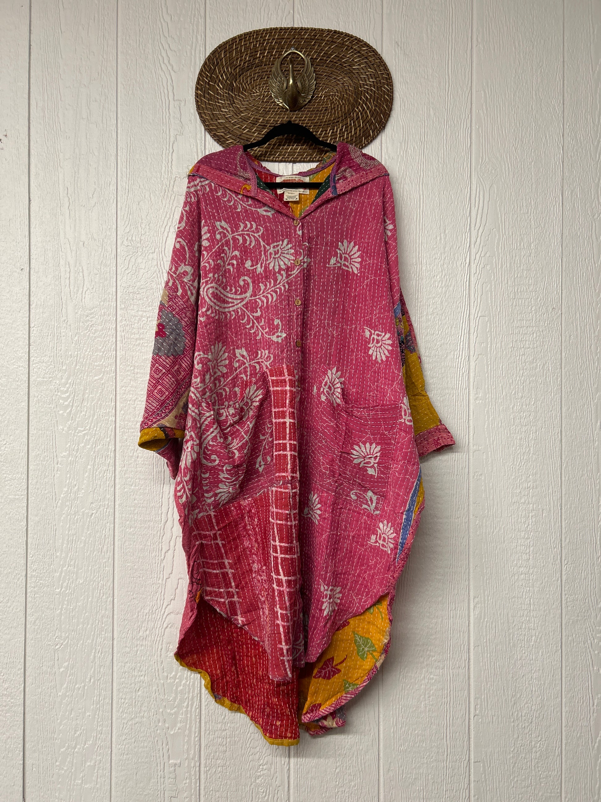 Made from our hand kantha stitched vintage cotton sari, this piece of wearable art features a Button-down opening with functional buttons, slouchy outer pockets, billowy sleeves, a rounded hemline and a vibey hood. The perfect maxi to compliment your favorite kantha pants or bell bottoms.