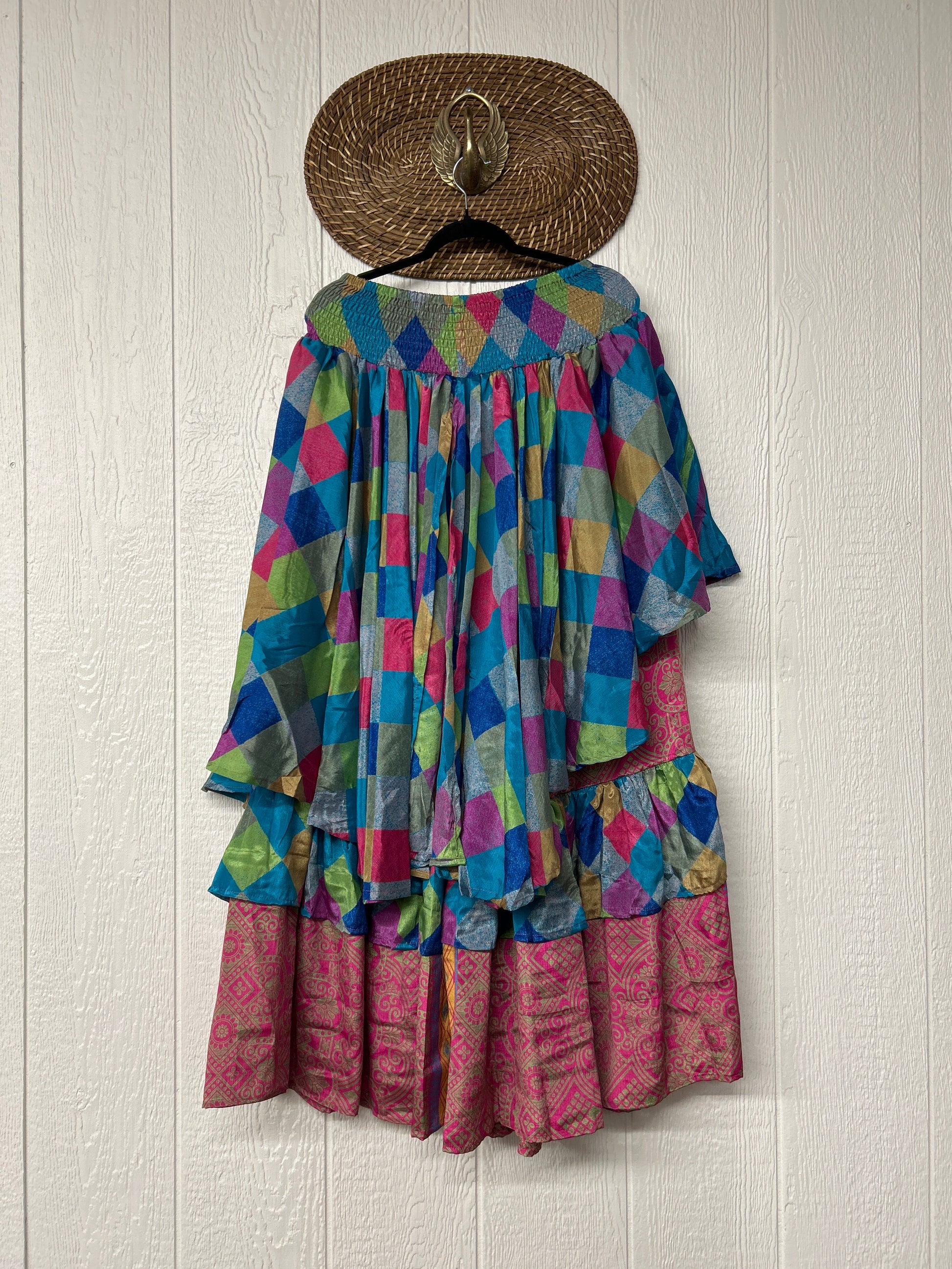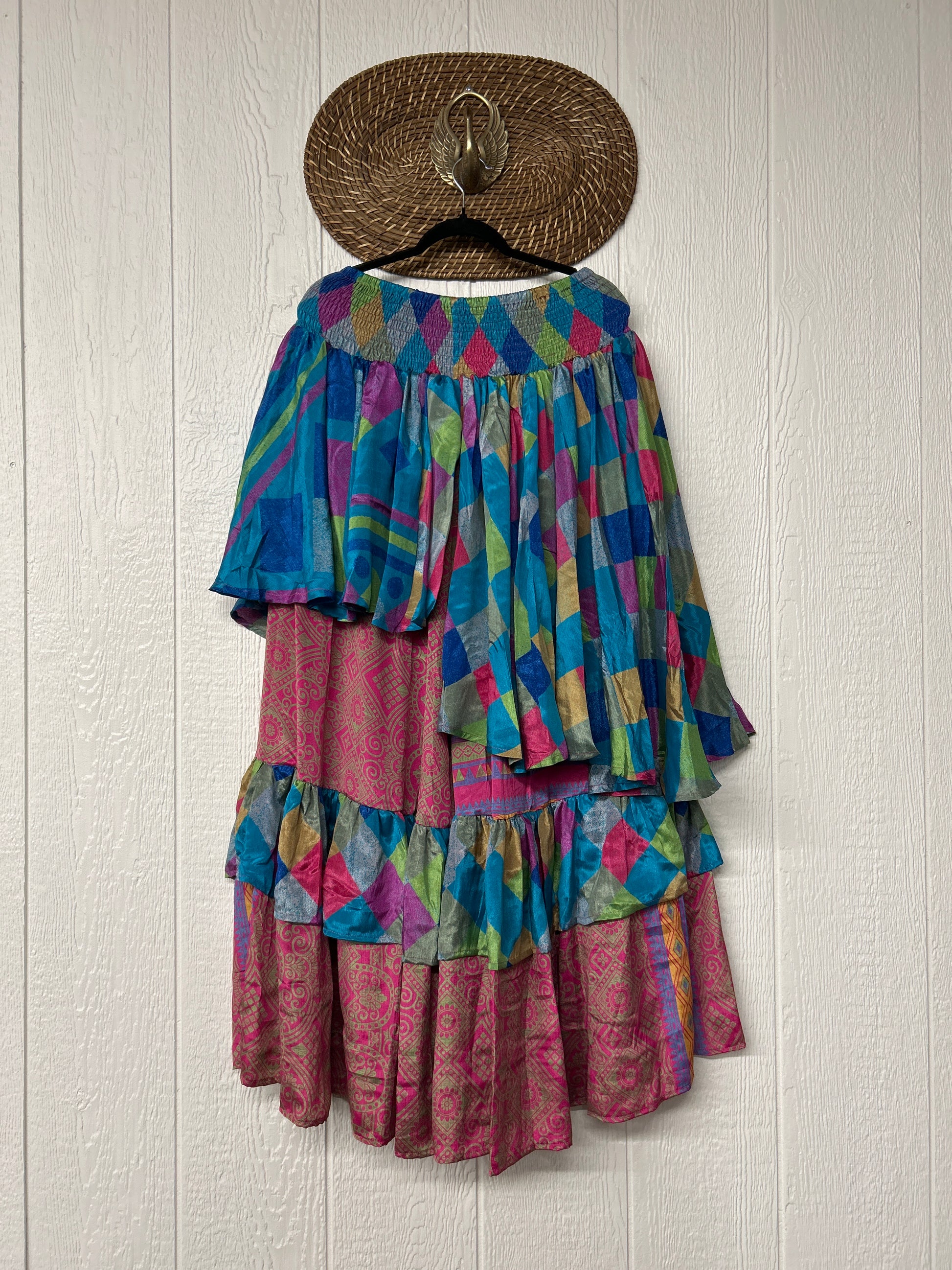 Crafted from vintage rasgulla sari these ethereal pants features stretchy waist, super wide legs, double tier hem and a skirt layer. these pants will make you want to dance! One size, recommended up to size 22/24 Crafted and sewn by families in a small village in Northern India providing work and a fair living. This product should be hand washed and line dried for longest life. For softness, fluff in the dryer on low heat after it has dried from hand washing. Disclosure: Our vintage styles have lived a full life before becoming the designs in our shop. Fabrics may have small threads or holes in the layers. Color inconsistency or small stains may be present. The saris are sewn together and extend the life of each design. Imperfections should be celebrated.